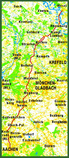Auf dem Fahrrad direkt von Aachen nach Wesel: Eigentlich macht die Route einen leichten Bogen. Dadurch wird das Ballungsgebiet von Mönchen-Gladbach und Krefeld vermieden. So geht es erst nach Herzogenrath und Kerkrade, dann der Wurm folgend durch Geilenkirchen nach Hückelhoven. Dann Wegberg, Waldniel (zu Schwalmtal), Nettetal, Wachtendonk, Nieukerk (zu Kerken), Sevelen, knapp westlich an Kamp-Lintfort und Rheinberg vorbei, das letzte Stück auf dem Radwanderweg auf dem Rheindeich. | ||