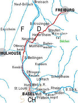 Per Fahrrad direkt von Basel nach Freiburg im Breisgau: Rechtsrheinisch ist auf den ersten 25 km ab Basel nicht viel Platz zwischen Rhein und Hügeln. So liegt sowohl die endlos lange Schotterstrecke auf dem Rheindamm als auch ziemlich groß ausgebaute Landstraße immer wieder recht nahe an der Autobahn. Darum wurde für die Strecke von Basel bis Neuenburg die französische Seite gewählt. da im südlichen Teil auch die piste cyclable am Canal du Rhône au Rhin geschottert ist, geht die Routenempfehlung möglichst auf kleinen Straßen durch die Dörfer. So hat man auch mehr Abwechslung auf dem Fahrrad. Am neuen Kanalknoten zwischen Kembs und Niffer benutzt die Route auch ein Stück Radwanderweg. Zwischen Hombourg, bei Ottmarsheim vorbei bis zur Rheinbrücke Chalampé Neuenburg ist die Straße leider etwas größer, nicht wenige LKWs, trotzdem kein dichter Autoverkehr. Östlich von Neuenburg geht es auf kleinen Ackersträßchen durch die Ebene nach Heitersheim (Fahrradunterführung am Sulzbach). Von Heitersheim führt die Route auf Nebenstraßen und einem Stück Radwanderweg etwas hügelig durch kleine Dörfer und Oberkrotzingen (Ortsteil von Bad Krozingen) nach Schallstadt. Von dort nach Freiburg-St.Georgen kann man auf einem Stück ehemaliger Bundesstr. Hügel vermeiden. Durch die Vororte von Freiburg gelangt man leicht auf dem Straßenzug Andreas-Hofer-Str. - Lörracher Str. |