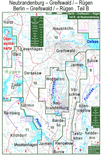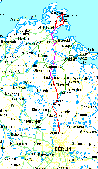 Auf dem Fahrrad von Berlin direkt nach Greifswald und nach Rügen: Vom Stadtzentrum Berlins führt eine Fahrradroute auf dem ehemaligen Mauerstreifen nach Schildow. Von dort geht es auf Landstraßen nach Liebenwalde. Dann kommt der asphaltierte Radwanderweg am Vosskanal nach Zehdenick. In die Altstadt von Zehdenick fährt nman mit dem Fahrrad am besten auf der Berliner Str. und verlässt sie nach Einkehr und evt. Besichtigung durch die selbe Straße. Die anderen Zufahrten haben übles Kopfsteinpflaster. Von Zehdenick führt der Radfernweg Berlin Kopenhagen größtenteils asphaltiert durch den Ziegeleipark an der Oberhavel nach Marienthal. Die Route von Marienthal nach Himmelpfort lässt sich gegenüber dem Radfernweg Berlin-Kopenhagen in einigen Abschnitten abkürzen. Von Lychen folgt die Route Nebenstraßen nach Burg Stargard und Neubrandenburg. Neubrandenburg wurde 1248 gegründet, als typische ostdeutsche Kolonialstadt mit rundem Umriss und schachbrettförmigem Straßennetz. Neubrandenburg hat einen gut erhaltenen mittelalterlichen Mauerring mit 4 Toren. Die Bebauung in der Altstadt vonNeubrandenburg wurde aber am Ende des zweiten Weltkrieges fast vollständig zerstört. Bei erhaltenem mittelalterlichen Straßennetz zeigt Neubrandenburg so die verschiedenen Bauperioden von 40 Jahren DDR. Von Neubrandenburg nach Altentreptow folgt die Route teilweise dem Tollense-Radwanderweg. Der Autoverkehr auf der L 35 (ehemalige F96 bzw. B96) hat seit der Fertgstellung der Ostseeautobahn in einigen Abschnitten etwas, in anderen stark nachgelassen. Zwischen Neubrandenburg und Altentreptow hat die Straße immer noch deutlich mehr KFZ-Belastung als die Straße auf der Westseite des Tollensetals, die daher zu bevorzugen ist. Nördlich von Altentreptow fehlt ein Stück weit eine brauchbare Alternative zu der alten Fernstraße. Von Mülenhagen bis kurz hinter Burow kann man jedoch auf gutem Belag durch Felder und Wiesen radeln. Von Klempenow bis Jarmen und noch ein kurzes Stück über die Peene hinweg fahren die meisten Autos auf der nur etwa 1 km entfernt parallel verlaufenden Autobahn. Die L 35 hat hier einen Radweg bekommen, der aber von der KFZ-Belastung her eigentlich überflüssig ist. Da der Radweg etwa eine halben Meter tiefer als die Fahrbahn angelegt wurde, wird man bei Dunkelheit von entgegen- kommenden Autos so star geblendet, dass der Radweg lebensgefährlich ist und man mit dem Fahrrad wesentlich sicherer auf der Fahrbahn fährt. Ab der Abfahrt Gützkow benutzt der meiste Autoverkehr zwischen Berlin und Greifswald die L 35. Kurzz hinter Breechen kann man westlich auf eine Nebenstrecke ausweichen, dei bis Görmin sehr ruhig ist, dann wenig bis mäßigen Autoverkehr hat. Schon gleich nach der Peenebrücke links abzuzweigen würde eine Fahrt auf ziemlich unangenehmen Belägen bedeuten. Von Dersekow über Levenhagen nach Kirchdorf führt die kürzeste Route von Berlin zur Rügenfähre StahlbrodeGlewitz. Wichtige Wege wurden hier in den letzten Jahren asphaltiert. Zwischen Groß Petershagen und Kirchdorf gibt es die Wahl zwischen einem Waldweg mit festgefahrener Decke mit hoem Sanddanteil und einem kleinen Umweg durch das Dorf Horst, leider mit 1/2 km üblem Kopfsteinpflaster. Das letzte Stück neben der B 96 bis Reinberg hat Kleinsteinpflaster. Zu Stunden geringen Autoverkehrs können gut trainierte Radler mit wenig Gepäck allerdings die Hauptfahrbahn der B96 benutzen; die ist nälich nicht als KFZ-Straß,e ausgeschildert, sondern mit 30 km/h Mindestgeschwindigkkkeit. Von der Rügenfähre gelangt man über die Halbinsel Zudar nach Garz, der ältesten Stadt auf Rügen. Um von Garz per Fahrrad zu den Glanzpunkten von Rügen zu gelangen, den Jasmunder Bodden, Kap Arkona und die Kreidefelsen von Stubbenkammer, oder um eine Fähre im Fährhafen Sassnitz-Mukran zu erreichen, erfordert das Straßen- und Wegenetz der Insel einige Kompromisse. Es gibt zwar gute Teilstücke fü,r Routen, aber keine durchgehend gute Route. Denn Rügen ist zwar die schö,nste deutsche Insel, hat aber ziemlich viel Autoverkehr, seine Nebenstraßen teilweise Fahrrad-feindliches Kopfsteinpflaster. Und die Radwanderwege ... Schön sind die Wegweiser ja. |