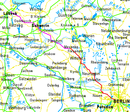| Teil A, Brandenburg: Berlin Neuruppin Wittstock Meyenburg | Teil B, Mecklenburg: Meyenburg Parchim Schwerin Lübeck | |