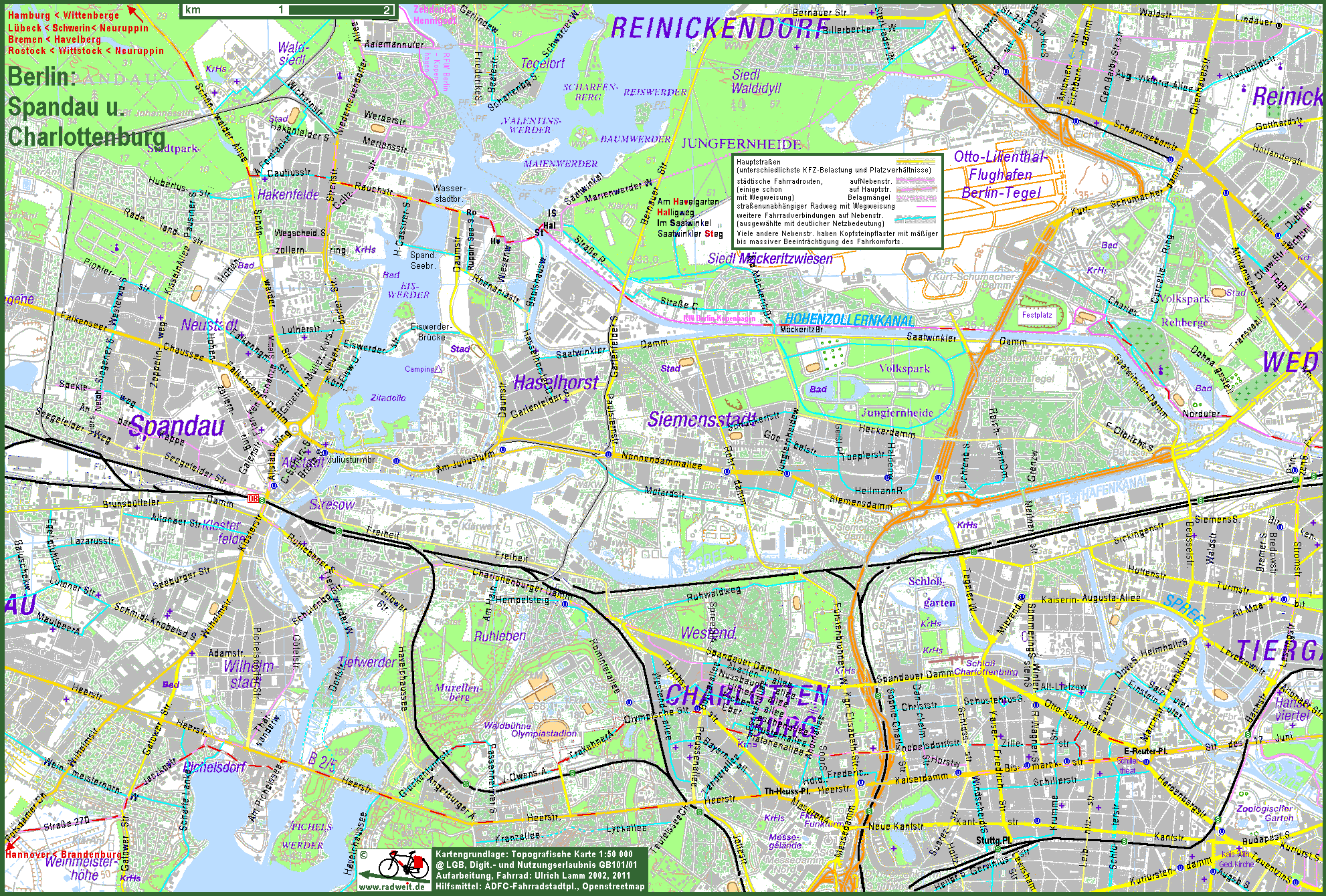 Stadtplan von Berlin mit Radverkehrsnetz auf Basis der topografischen Karte 1:50 000 mit wichtigen Straßennamen, den städtischen Fahrradrouten sowie Empfehlungen ohne Wegweisung. Anbindung von direkten Fahrrad-Fernrouten.