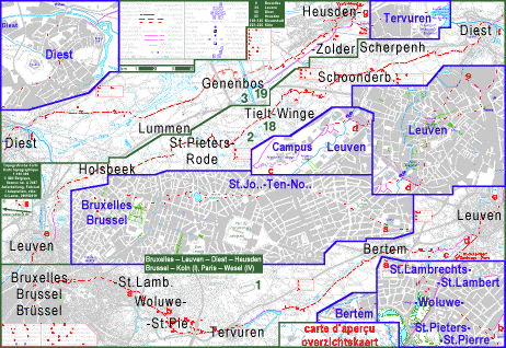 En vélo directement de Bruxelles à Düsseldorf ou de Düsseldorf à Bruxelles: Ce parcours entre Bruxelles et Köln (également de Bruxelles à Cologne et de Cologne à Bruxelles) évite le plupart des villes entre Louvain et Neuss. Du centre de Bruxelles au limite des la Region Capitale de Bruxelles le parcours est pas trop pollu par voitures et pas trop dificile à suivir, mais il n'est pas plain. De Tervueren à Louvain l' itinéraire suit la vallée de la Voer. Le vieux bourg et entrèe à vélo mieux sur la Naamsestraat que sur l'itnéraire officiel. Entre Louvain et Diest le parcours utilise routes moyennes et routes vicinaux. Entre Louvain et le Canal Albert le plupart du parcours est tranquile. De Heusden et Bilsen en deux sections il-y-a une alternative plus directe et une plus tranquile. Le reseau cyclable officiel et seulement utilisée partiellement, parce que sa maxime est loisir en vélo plus que mobilité écologique en vélo. Pour traverser la Meuse il-y-a deux bacs. Un travaille toute année de 7°° à la nuit. L'autre seulement travaille en été et ne commence avant 10°°. En Allemagne, de Selfkant a Köln (Cologne), la section plus occidentale est bien tranquile, et aussi la section entre Kückhoven (prà d' Erkelenz) et Neuss-Grefrath. . |