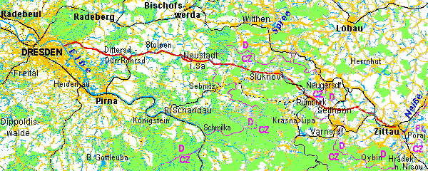 Sie Führt nur durch wenige kleine Städte: Neustadt in Sachsen, S&Mac255;uknov und Rumburk in Tschechien