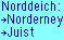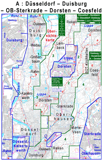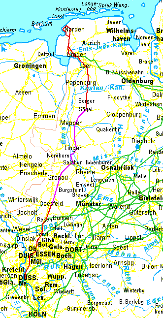 Per Fahrrad direkt von Rhein und Ruhr zu den wichtigsten Häfen Ostfrieslands: Zur Routenplanung: Eine gleichwertige Route westlich der Ems durch Bourtenger Moor und Rheiderland zum Fähranlger Ditzum läge zwar näher an der Luftlinie, wäre aber allenfalls 5 km kürzer. Durch die mindestens 15 Minuten Überfahrt von Ditzum nach Petkum würde dieser Vorteil aufgezehrt. Darum wurde diese Variante nicht abgefahren. Von Rhein und Ruhr nach Borkum gibt es eigentlich weiter westlich eine kürzere Verbindung: Delfzijl in den Niederlanden liegt auf gleicher Höhe (geografischer Breite) wie Emden, Eemshafen 10 km weiter nördlich. Die Überfahrt von Delfzijl nach Borkum ist 3/4, die von Eemshafen nur halb so lang wie von Emden. Beschreibung der Route: Aus Düsseldorf nach Kaiserswerth kann man wahlweise autofrei uaf dem Rheindeich (Radwanderweg Rheinschiene) oder etwas kürzer auf nur mäßig belasteten Stadtstraßen fahren (Radverkehrsnetz NRW). Von Düsseldorf-Kaiserswerth nach Norden ist beiden Wegweisungen eine Route durch die Felder nech Duisburg-Rahm vorzuziehen. Denn die rheinnahen Stadtteile von Duisburg sind durch große Industrieanlagen geprägt, der Ostrand dagegen durch angenehme Wohngegenden und Sportstätten (Stadion in Duisburg-Wedau). Überhaupt ist das eigentliche Duisburg nur eine von drei deutlich voneinander getrennten Teilstädten. Die andern beiden sind das linksrheinische Duisburg mit dem Zentrum Rheinhausen und die endllos sich dehnenden Stadtteile nördlich der Ruhrmündung (Ruhrort, Meiderich, Hamborn, Walsum). Die Route nach Ostfriesland folgt nördlich der Ruhr dem Rhein-Herne-Kanal nordostwärts, verlässt ihn dann nordwärts nach Oberhausen-Sterkrade. Nach dessen Vororten endet die Stadtlandschaft des Ruhrgebiets. Durch liebliches Bauernland radelt man westlich an Bottrop -Kirchhellen vorbei nach Dorsten. In Dorsten wird die Lippe samt begleitendem Wesel-Datteln-Kanal überquert. Von Dorsten durch Lembeck nach Reken fährt man mit dem Rad durch aber nicht über die Hohe Mark. Über Maria Veen gelangt man nach Coesfeld am Westrand der Baumberge. Coesfeld lässt sich leichter auf Nebenstraßen durchqueren als umfahren. Im nordwestlichen Münsterland führt die Route durch Rosendahl-Osterwick, Schöppingen, Metelen, Ochtrup-Welbergen, von dort durch die einsame Brechte nach Salzbergen in Niedersachsen. In Salzbergen wird die Ems überquert. Zwischen Ems und dem hier von Südosten kommenden Dortmund-Ems-Kanal geht es nordwärts nach Lingen-Bramsche östlich des Kanals (Nicht verwechseln mit Bramsche bei Osnabrück!). Das eigentliche Lingen durch ländliche Eingemeindungen umfahrend und dann in Stück weit durch die Emsniederung gelangt man nach Bokeloh an der Hase, Ortsteil von Meppen. Von hier gibt es eine gute Strecke durch die Geestlandschaft des Hümmling mit den Orten Sögel (Schloss Clemenswerth am Ostrand von Sögel ist eines der bedeutendsten Bauwerke des westfälischen(!) Barock.), Werpeloh und Börger. Der Schießplatz Hümmling wird inzwischen so selten benutzt, dass man von Börger nach Börgerwald (zu Surwold) meistens die Nebenstrecke nehmen kann (asfaltierter Waldweg). Vom Nordrand des Hümmling gelangt man auf per Fahrrad fast ohne Umwege druch Rhauderfehn zur Ledabrücke im Leer (Ostfriesland). In Leer ist östlich des Stadtzentrums die ausgeschilderte Veloroute zu bevorzugen, nördlich gibt es eine parallele ebenso ruhige Straße mit besserem Belag. Von Leer nach Oldersum (zu Moormerland) orientiert sich die empfohlene Route mehr an der Ems als die amtlicheWegweisung. Ab Oldersum ergeben sich verschiedene Varianten je nach Ziel (Emden Außenhafen mit Fähren nach Borkum, Emden Stadt mit Kesselschleuse und alten Häfen, an Emden vorbei nach Norddeich) und Qualitätsanforderungen (schotterfrei versus autofrei). Die Empfehlungen durch Emden und daran vorbei (eher etwas kürzer) treffen sich in dem alten Warftdorf Wirsum. Die Routenwahl durchs Marschland nach norddeich wird durch das Norder Tief bestimmt. Dieser Fluss ist zwischen dem alten Siel am Deich der Leybucht und dem Stadtzentrum von Norden nicht zu überqueren. Die Route am Seedeich ist trotz großen Bogens kürzer als die durch die Stadt Norden. Am Seedeich kann man mit dem Fahrrad sowhl land- als auch seeseitig fahren: Der Deichverteidigunsweg auf der Landseite (Asfalt / Beton) hat an den Grenzen der Viehweiden unverschlossene Klapptore. Auf der Seeseite ist der Deichfuß bis fast zu einem Drittel der Deichhöhe asfaltiert. Ein Streifen mit mehreren dichten Pollerrreihen, der bei Sturmflut als Wellenbrecher dient,teilt die asfaltierte Fläche in zwei befahrbare Wege. Der untere hat weniger Seitengefälle, kann aber bei Flut und auflandiger Brise etwas Gischt abbekommen. Der obere hat ein gewöhnungsbedürftiges Zeitengefälle, ist aber beitrockenem Wetter mit einspurigen Fahrzeugen auch gut befahrbar. |