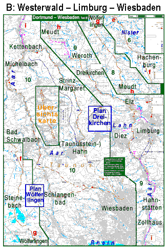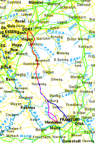 Auf dem Fahrrad direkt von Dortmund nach Wiesbaden: Auf dem Fahrrad direkt von Dortmund nach Frankfurt am Main: Gleich zu Anfang 2 Varianten: Flacher und etwas kürzer durch Herdecke und Hagen, deutlich ruhiger durch Hohenlimburg (Lenne), Nahmer, Lüdenscheid. Ab Hagen oder erst ab Lüdenscheid durchs Tal der Volme,dann entlang der Aggertalsperre nach Gummersbach-Herschlag. Über zwei weitere Wasserscheiden gelangt man erst an die Wiehl und dann am Wisserbach hinab nach Wissen an die Sieg Die Strecke durch den Westerwald ist ziemlich bergig. Zwischen Wissen und Hachenburg befindet sich dasTal der Nister, dem man leider nicht durchgehend folgen kann. Die Blicke über das gewundene Tal gehören allerdeings zum Schönsten, was das Rheinischen Schiefergebirge zu bieten hat. Von Hachenburg hügel es sich so dahin bis Elz bei Limburg (Lahn). Von Limburg über den den Taunus nach Wiesbaden: Ab Limburg zunächst durchs Aartal (Aartal-Radwanderweg), dann durch ein östliches Seitental nach Taunusstein. Auf der Passhöhe "Eiserne Hand" kommt man auf die südlich von Hahn (Taunus) stark belastete B54, auf der man aber sehr schnell bergab nach Wiesbaden gelangt. Nordwärts überquert man den Taunus besser weiter wsetlich bei Bad Schwalbach. Da ist die Auffahrt etwas ruhiger als auf der B54. Dafür hat man dann nördlich des Taunuskammes im oberen Aartal mehr Bundesstraße zu fahren. Im Abschnitt zwischen Bad Schwalbach und Michelbach(Taunus) ist die B54 allerdings relativ ruhig und wird viel von Radlern benutzt. | |||