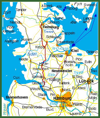 Die Route ist vor allem zur Reise von und nach Dänemark gedacht. sie folgt etwa dem historischen Ochsenweg. Anders als beim Radwanderweg werden aber Umwege und schlechte Wegstrecken vermieden. Von Flensburg geht es durch Tarp, Jübek und Gr. Rheide westlich an Schleswig vorbei. Von Schleswig kommt man durch Busdorf, wo die Wikingersiedlung Haithabu lag. In Kropp am Ochsenweg treffen sich die Routen. Die Eider wird zwischen Hamdorf und Breiholz überquert, der Nordostseekanal mit der Fähre Oldenbüttel. Südlich von Hademarschen kommt noch einmal ein Stück auf dem Ochsenweg. Dann führt die Route westlich an Itzehoe vorbei und folgt der Stör bis Borsfleth. In Glückstadt kann man direkt zur Elbfähre radeln, der wichtigsten Querung der Elbe für Radtouren von Westdeutschland nach Schleswig-Holstein und Jütland. Man kann aber auch einen Abstecher in die hübsche Altstadt machen. Der historische Ochsenweg führte übrigens nicht von Glückstadt nach Jütland, sondern von Hamburg (Vgl. Stadtteil Ochsenzoll). Interessanterweise führte der westlich Hauptweg an den Hafenstädten Schleswig und Flensburg vorbei. Die waren nur über Abzweigungen zu erreichen. Heute ist der Ochsenweg in örtlich ganz unterschiedlichem Zustand, vom kaum befahrbaren Pfad (zw. breit auseinander liegenden Knicks) bei Schleswig über gut zu radelnde asphaltierte Bauernstraßen bei Hademarschen bis zur stark von LKWs befahrenen Umgehungsstraße von Flensburg. |