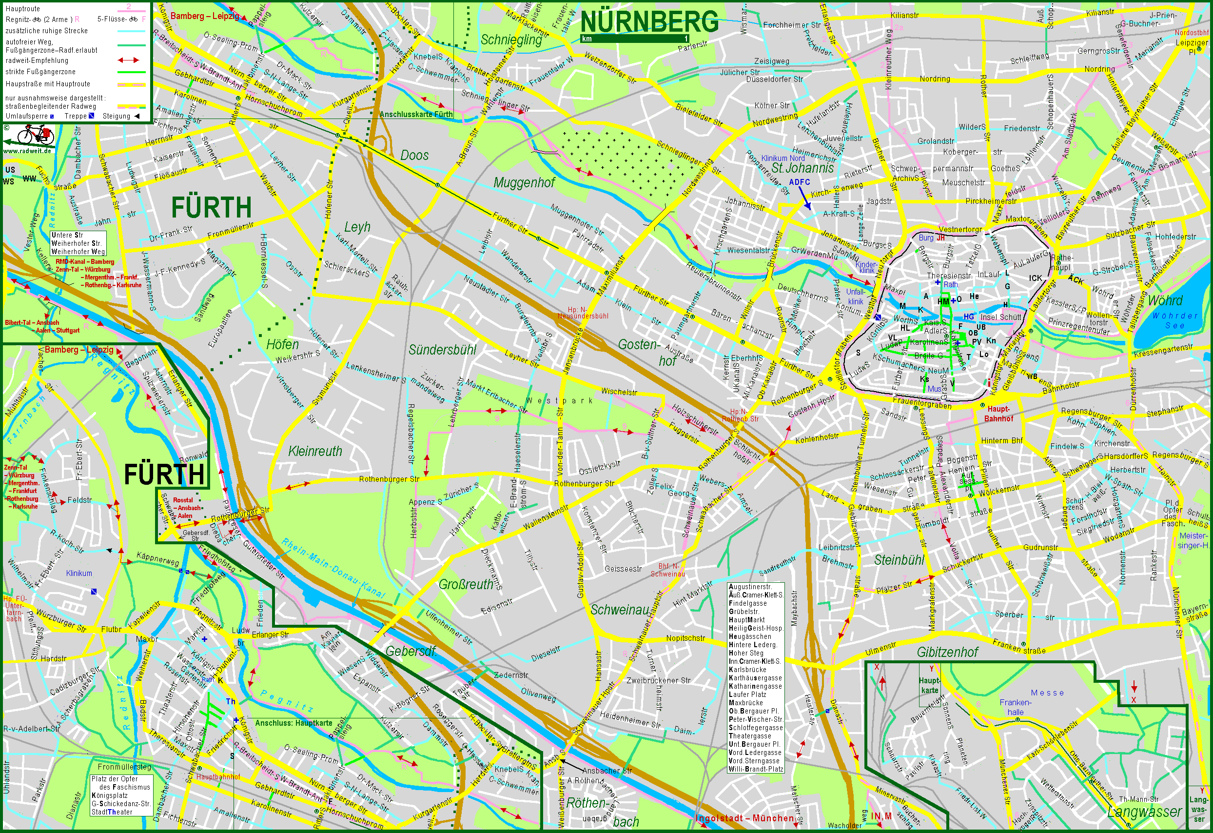 Stadtplan von Nürnberg und Fürth mit ausgeschilderten Fahrradrouten und ergänzenden Streckenempfehlungen fürs Fahrrad: