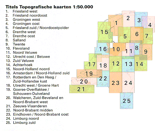 Niederlande 1:50 000 Blattschnitt der ANWB / VVV -Ausgabe der Topografischen Karten, Kaartbladindeling van de ANWB / VVV Topografische kaarten van Nederland Da man in Deutschland ja kein VVV-Büro in der Nähe hat, sei hier auf einen Versand hingewiesen, bei dem die K arten zum niederländischen Ladenpreis zu beziehen sind: Link: ![]() Die für Ferntouren geeigneteren Toeristenkaarten 1:100000 werden leider nicht mehr produziert und verkauft. Die 50000er Topografische Kaarten von ANWB / VVV haben einen praktischeren Blattschnitt als die Originalkarten des Topografische Dienst. Sie zeigen den vollständigen Inhalt der Originalkarte, ergänzt um außerörtliche Radwege und Position und Nummern der Paddestoelen bzw. Wegweiser. |