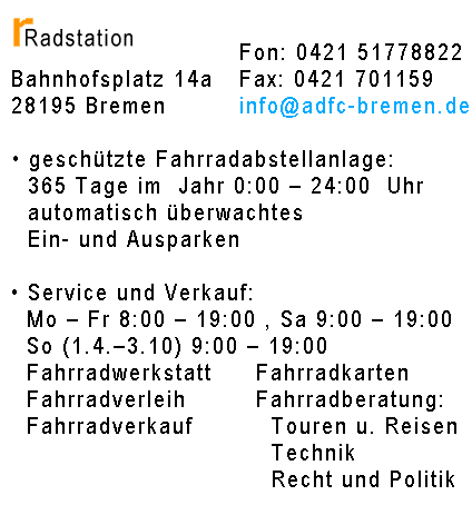 Inhalt und Beschränkung dieses Radverkehrsstadtplans: Dieser Stadtplan enthält nicht die Namen aller Nebenstraßen, keine Fahrradläden und nur wenige touristische Hinweise. Als Radverkehrsstadtplan konzentriert er sich auf Routenempfehlungen und auf Status und Qualitä,t der Radwege Straßen, straßenbegleitende Radwege, straßenunabhängige Radwege Die Einteilung der Radwege im vorliegenden Fahrradstadtplan von Bremen orientiert sich weitgehend an den ADFC-Empfehlungen für Fahrradstadtpläne. Obwohl die Zahl der Streckensignaturen an die Grenzen des Möglichen stößt, bleiben einige Wünsche offen: Was sind gute Radwege, was schlechte? Nur wenige Radwege in Bremen sind breit, gerade und so eben wie die Fahrbahn daneben. Nur wenige Radwege in Bremen erzwingen eine Fahrgeschwindigkeit unter 15 km/h. Das große Mittelfeld nervt mal mehr, mal vergisst man, dass es auch besser geht. Wo sich die Qualität mit dem Zentimetermaß bestimmen lässt ist es noch einfach. Bei Verschwenkungen und Verschleiß ist dei Grenze schwerer festzulegen. Welcher Art sind die Mängel? Je nach Fahrstil, Verkehrssituation, Witterung usw. interessieren unterschiedliche Qualitäten von Radwegen über die Wahl der Route und, nachdem ein großer Teil der blauen Schilder verschwunden ist, über die Wahl zwischen Radweg und Fahrbahn. So mancher Radweg ist eben aber viel zu schmal, breit aber schadhaft usw. . Ist die Oberfläche wasserfest oder Witterungsanfällig? Oder der Radweg selber ist ausreichend, aber der Gehweg daneben fasst den zahlreichen Fußgängerverkehr nicht. Oder der Radweg wird regelmäßig beparkt. Mehr Logos könnten da Aufschluss geben, würden aber die Geografie des Netzes unkenntlich machen. Die Darstellung von Verkehsregelungen wird erschwert, wo die Beschilderung unsystematisch ist. Radwegebenutzungspflicht: Dieser Fahrradstadtplan unterscheidet benutzungspflichtige Radwege (Pflichtradwege) und nicht benutzungspflichtige (freie Radwege). Er unterscheidet zwischen kombinierte Geh-und-Radwege (benutzungspflichtig) und solchen Gehwege, die laut Zusatzzeichen auch Radfahrer benutzen dürfen, so sie unbedingt wollen. Zurzeit sind in Bremen eigendlich nur die besten und ein Teil der schlechtesten Radwege benutzungspflichtig. Bei dem großen Anteil freier (StVO: anderer) Radwege wären eigentlich auch Besonderheiten der Fahrbahnen darzustellen, z.B. einspurige Richtungsfahrbahnen, auf denen man sich schnell den Zorn der Autofahrer zu zieht, auch wenn das Radfahren auf der Fahrbahn erlaubt ist. Besonders ärgerlich ist in diesem Zusammenhang die noch in Bau befindliche Daniel-Jacobs-Allee in Borgfeld West, Wohnsammelstraße ohne Straßenbahn, 30 km/h aber keine Tempo-30-Zone, freie Radwege, einspurige Fahrbahnen, durchgehende Mittelinsel. Tempo-30-Zonen: Der größte Teil der Bremer Wohnstraßen sind Tempo-30-Zonen. Die StVO sieht hier Mischverkehr auf der Fahrbahn vor, da sich die Autofahrer den Bedürfnissen der Anwohner unterordnen sollen, während Radwege den Autoverkehr privilegieren würden. In Bremer Tempo-30-Zonen gibt es einen großen Restbestand an Radwegen. Sie sind in diesem Fahrradstadtplan nur dargestellt, wo StVO-widrig eine Benutzungspflicht angeordnet ist. Die Tempo-30-Zonen selber sind ihrer Ausdehnung halber auch nicht dargestellt Das Normale soll man nicht hervorheben. |