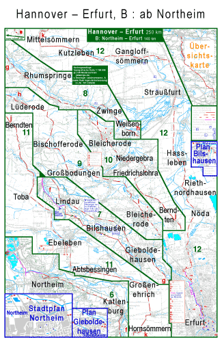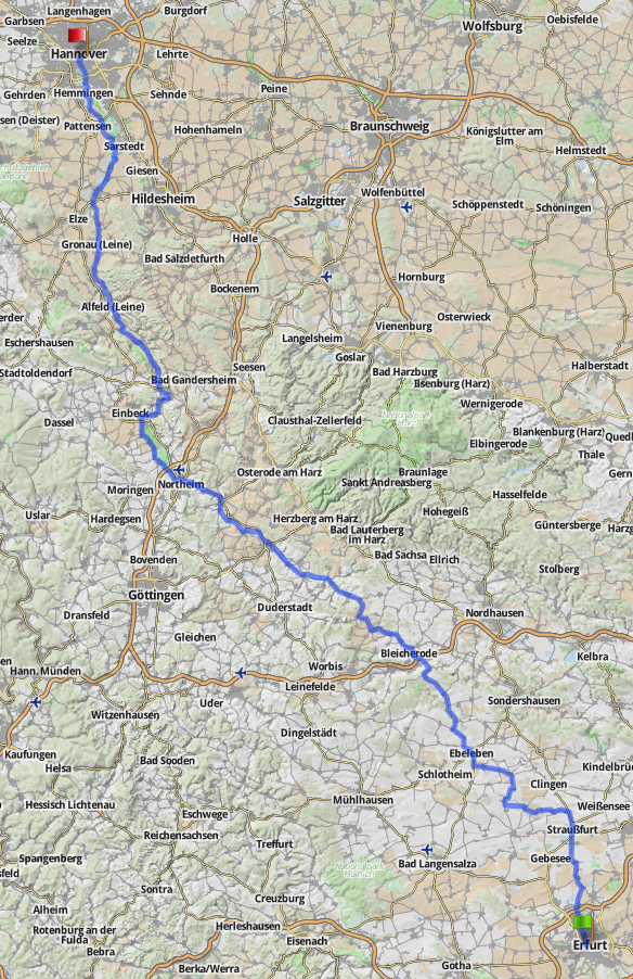 Auf dem Fahrrad von Hannover direkt nach Erfurt: Den Großraum Hannover verlässt die Route auf Nebenstraßen und Wirtschaftswegen, gegenüber dem Leineradweg an mehrereen Stellen abgekürzt. Bei Alfeld haben beide Talseiten ihre Vorteile. Die Stadt Alfeld hat leider noch nicht erkannt, durch Anlocken von durchreisenden wie einheimischen Radler/innen die hübsche Altstadt zu beleben. Von Kreiensen bis Northeim könnte der Leine-Radweg und damit die Route viel schöner und angenehmer (und dabei auch direkter) sein, wenn die Deichkronen des Hochwasserpolders zu Fahrradwegen gesteltet würden. Im unteren Rhume-Tal (bis Gieboldehausen) sind leider nur zwei Abschnitte ruhig und direkt, der Deich in Northeim (Umfahrung der Altstadt) und der Uferweg von Katlenburg durch Wachenhausen nach Lindau. Ansonsten kostet es Umwege und Hügel, hier den Radweg der Bundesstraße zu vermeiden. Von Gieboldehausen nach Zwinge und über die Wasserscheide nach Bischofferode und Bleicherode gelangt man gut auf kleinen und mittleren Landstraßen. Mehr Aiutoverkehr bei der Kreuzung des Wipper-Tals von Bleicherode nach Friedrichslohra. Oberhalb von Friedrichslohra kann man auf kleinere Straßen abbiegen und gelangt so über die Hainleite nach Ebeleben. Von dort nach Süden erspart ein kurzes Stück Bundesstraße mehrere Anstiege. Von Billeben durch Großenehrich nach Gangloffsömmern (Basilika) wenig Autoverkehr. Von dort nach Straußfurt gäbe es als Alternative zur B4 nur einen sehr holperig gepflasterten Wirtschaftsweg. Von Straußfurt nach Vehra iost der Radweg weit von der Bundestraße abgesetzt. Von Vehra gibt es eine direkte Nebenstraße nach Erfurt. |