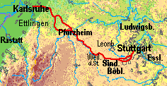 Per Fahrrad direkt von Karlsruhe über Pforzheim nach Stuttgart: Die Route geht durch das Pfinztal bis Keltern-Ellmendingen oder (wenig länger) ab Remchingen durch das Käpfelbachtal nach Pforzheim. Dort wird die Enz überquert. Bis zum Südrand von Pforzheim geht es durch Tal der Nagold, von dort an der (schwäbischen) Würm hinauf bis kurz vor Weil der Stadt. Von dort gelangt man nach Stutgart am besten den Rankbach hinauf durch Renningen und Magstadt. Nach Stuttgart hinein kommt man besonders ruhig, aber mit teilweis beachtlichem Gefälle (in Gegenrichtung also Steigung) hinter Büsnau nördlich an Stuttgart-Vaihingen vorbei und dann die Hasenbergsteige hinunter. Wegen der besagten Steilheit der Hasenbergsteige ist außer bei großem sportlichem Ehrgeiz in Gegenrichtung der teilweise laute, aber vom Höhenprofil her gemä,chliche Aufstieg durch die Böblinger Straße und Stuttgart-Vaihingen vorzuziehen. |