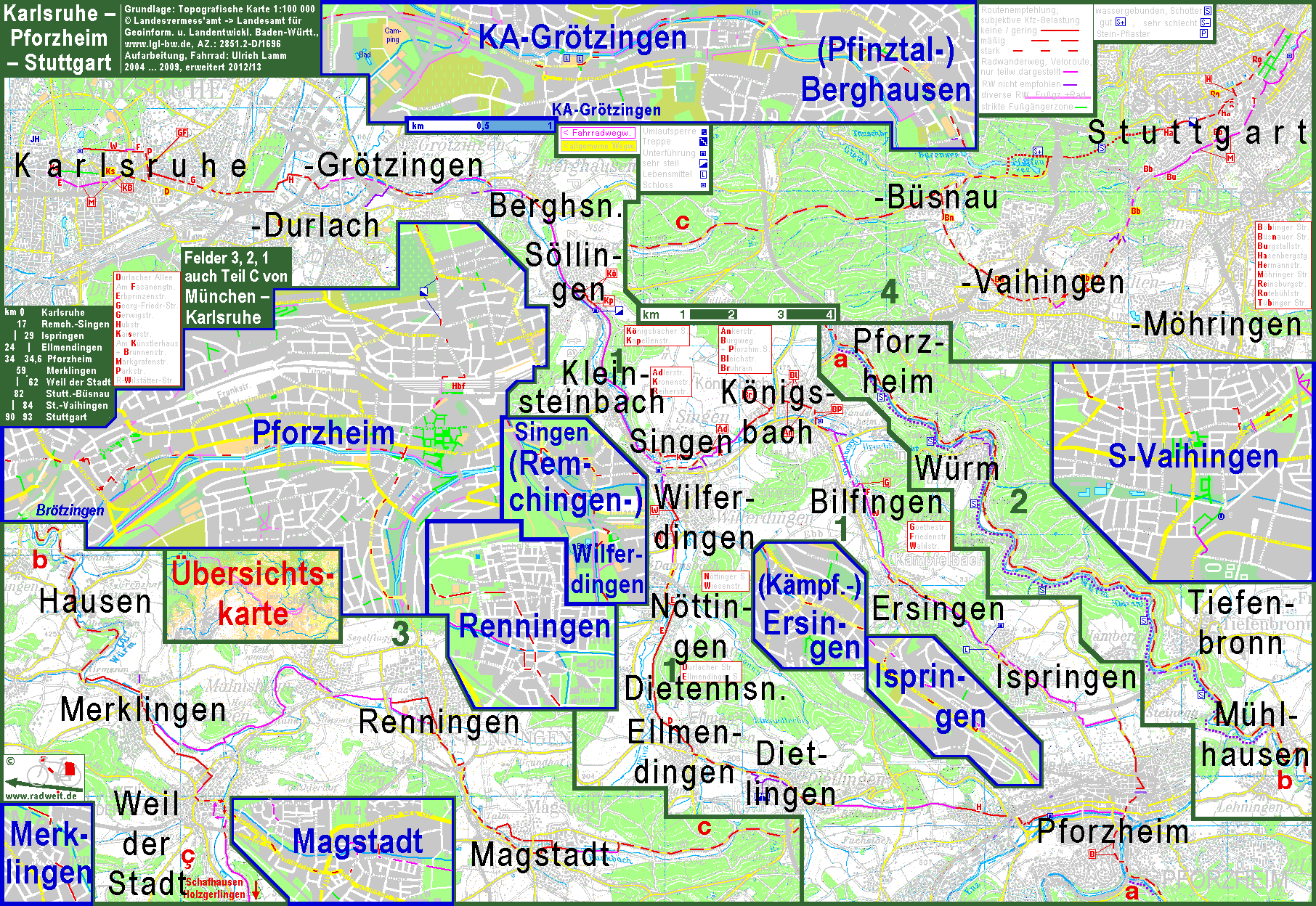 Tracks bei GPSies: • Karlsruhe Keltern Pforzheim Stuttgart • Stuttgart Pforzheim Keltern Karlsruhe • Karlsruhe Keltern Pforzheim S.Vaihingen Stuttgart • Stuttgart S.Vaihingen Pforzheim Keltern Karlsruhe • Karlsruhe Ispringen Pforzheim Stuttgart • Stuttgart Pforzheim Ispringen Karlsruhe Alternative, teilw. siehe Karte Paris • Pforzheim • Weil der Stadt (IV): • Karlsruhe Ettlingen Pforzheim Stuttgart |