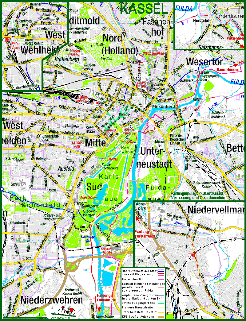Stadtplan von Kassel mit Fahrradrouten und Radfernweg.