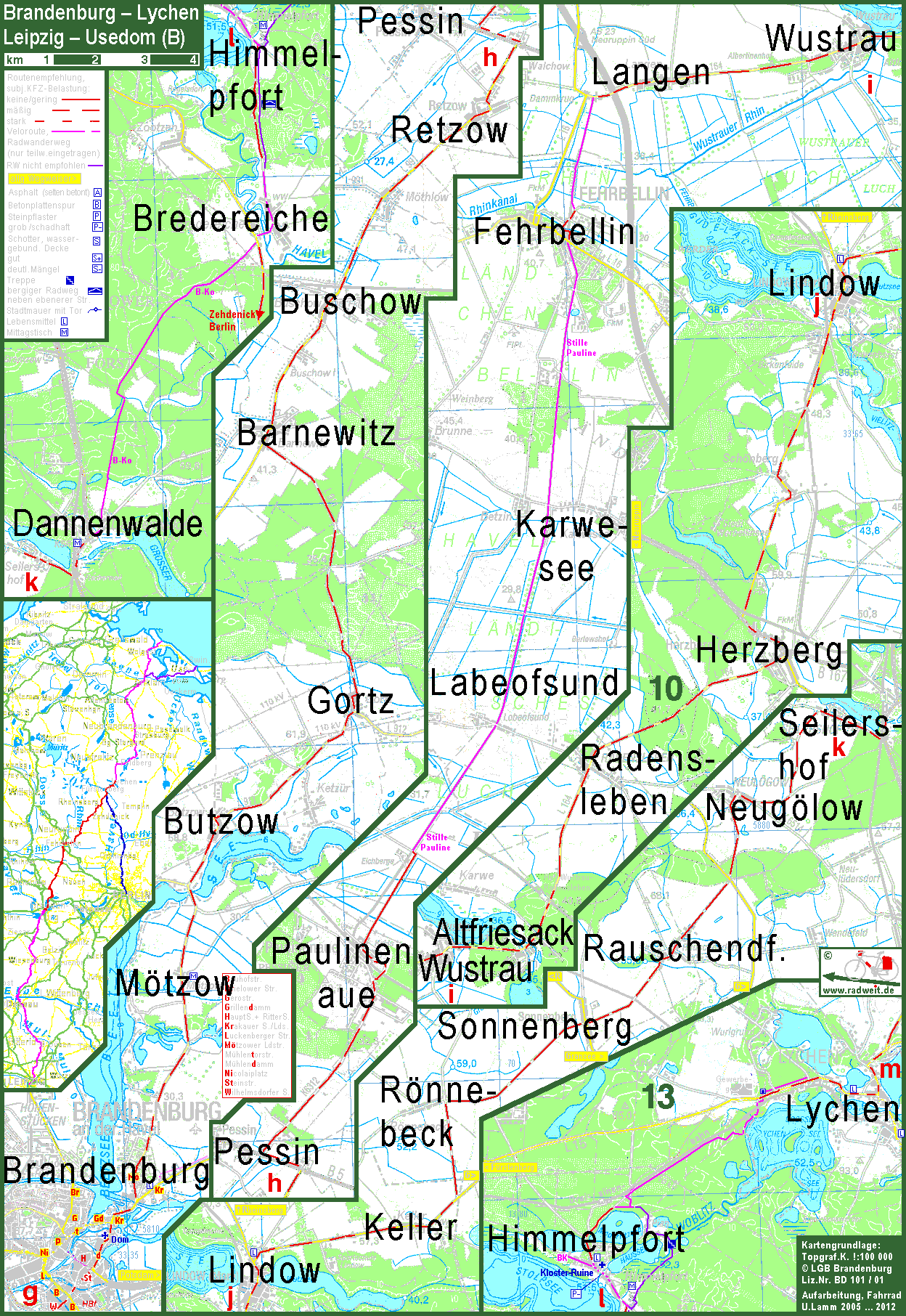 In Brandenburg lässt sich Kopfsteinpflaster leider nicht ganz vermeiden. Von Brandenburg nach Nordosten geht die Streckedurch Havelländisches Luch und Rhinluch. Bei Bredereiche wird die Havel noch einmal erreicht und überquert. . |