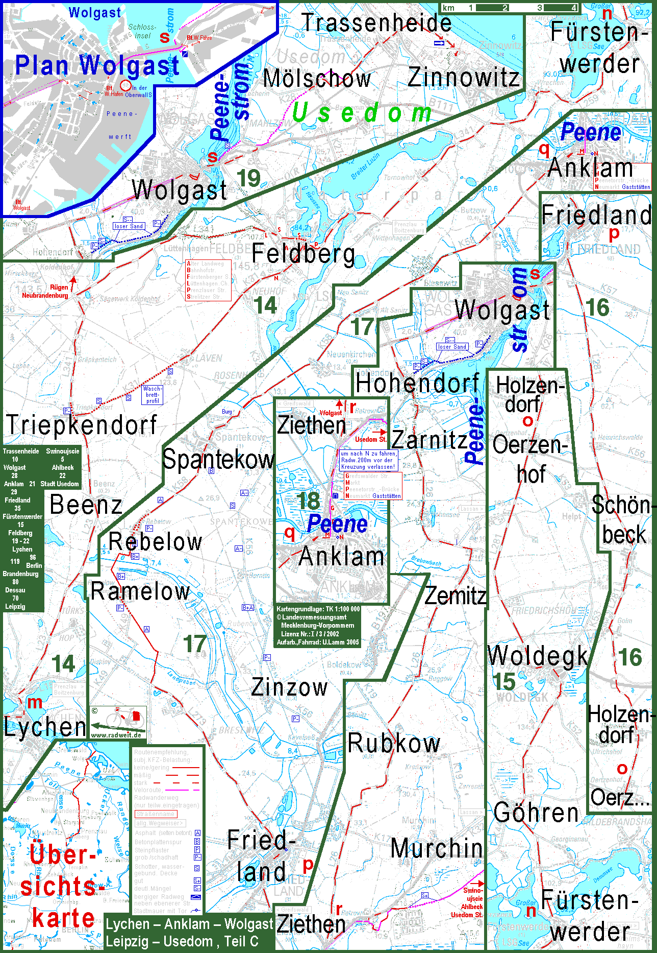 Hinter Lychen führt die Route durch die ziemlich hügelige Seenlandschaft von Feldberg und Fürstenwerder. Lychen und Fürstenwerder gehören zur Uckermark, Feldberg zu Mecklenburg-Strelitz. Von Fürstenwerder geht die Route geradewegs nach Norden durch Woldegk nach Friedland, gerade noch in Mecklenburg. Von Friedland nach Anklam kann man mit einem Bogen, der 5 km weiter ist als die Luftlinie, die stark KFZ-belastete B197 vermeiden. Die neu befestigte Querung eines Urstromtals zwischen Rebelow und Ramelow erleichtert dies sehr. Bei Anklam wird die Peene (Nebenfluss der Oder) überquert. nördlich davon gibt es zwei Müglichkeiten: Mit dieser Route ist die westliche dargestellt. Die Route geht nordwärts bis Wolgast. Bis Hohendorf ist der Autoverkehr ruhig bis mäßig. Auf den letzten km bis Wolgast ist leider die stark belastete B111 zu nehmen, da der südlichere Weg so sandig ist, dass er sichnicht durchgängiig befahren lässt. In Wolgast ist die Oberwallstr. zu umfahren, da für den Radverkehr gesperrt. Der Peenestrom (Mündungsarm der Oder) wird auf der eneuen Klappbrücke üquert. Von Wolgast zu den Seebädern im Nordosten von Usedom gibt es eine ruhige Nebenstrecke. Die Fahrt in den landschaftlich Interessanteren Osten von Usedom ist mit der Route Hamburg Usedom, Teil B, dargestellt. |