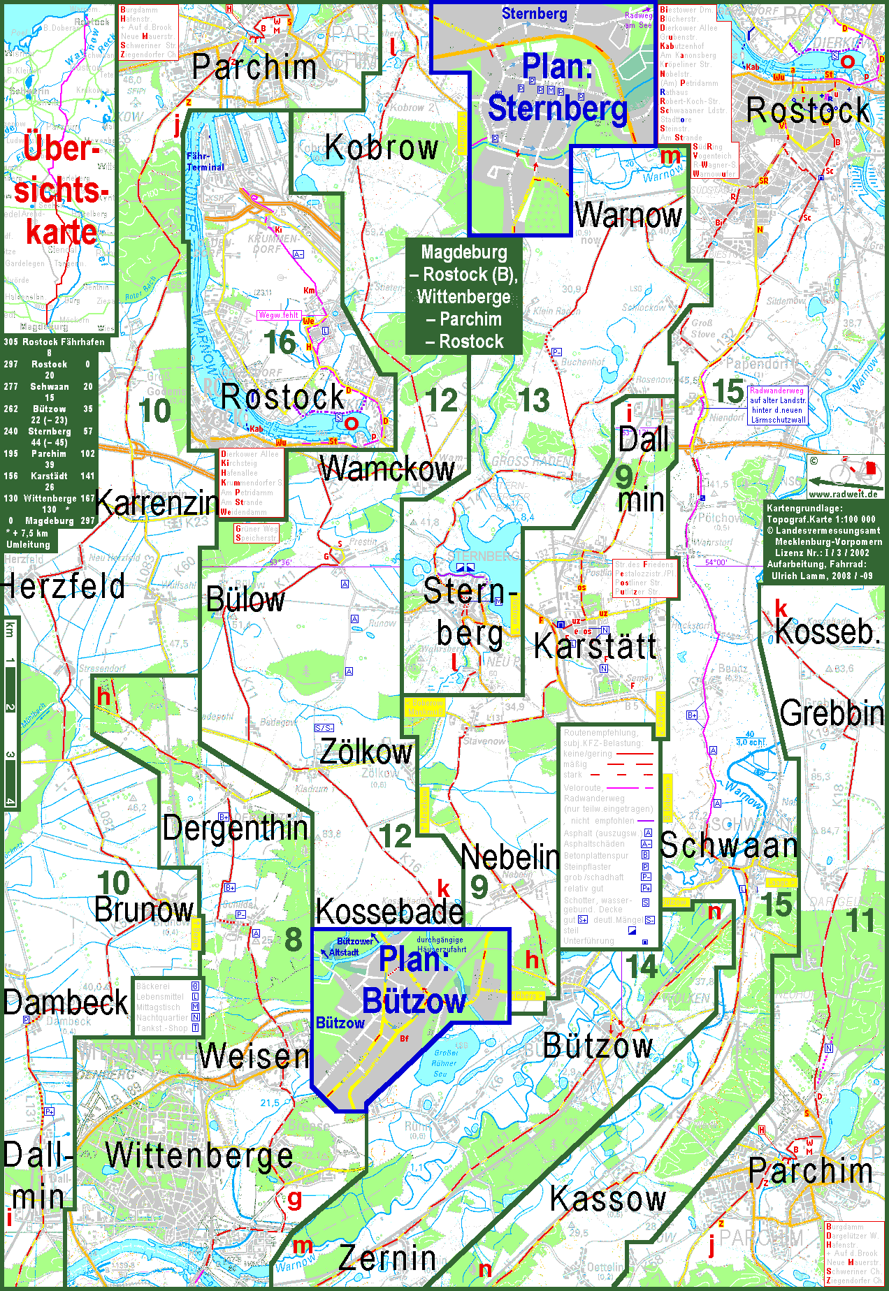 Auf dem Fahrrad direkt von Magdeburg nach Rostock Die Wahl der empfohlenen Route lässt sich Abschnitt für Abschnitt begründen. Magdeburg Rogätz: Die Fahrt auf dem Elberadweg rechts der Elbe würde eine zusätzliche Fährüberfahrt in Rogätz erfordern. Eine Route durch die westliche Elbaue hätte bis zur Autobahn entweder Umwege oder reichlich Autoverkehr, da die direkte Straße Teil der Autoverbindung MagdeburgB e r l i n ist. Die alte Landstraße (Breiteweg) nach Wolmirstedt ist durch die parallel laufende Schnellstraße entlastet. Rogätz Wittenberge: Im westlichen Teil der Elb-Aland-Niederung zwischen Wittenberge und Seehausen haben Lückenschlüsse im Netz befestigter Straßen und Wege eine kurze und überwiegend ruhige Route von Tangerhütte über Stendal und Seehausen nach Wittenberge möglich gemacht. Vorher, zwischen Tangerhütte und Stendal, verläuft die Route teilweise auf dem Altmarkradweg, einem insgesamt nicht zielführenden Rundkurs. Elbquerung: Es hat sich herausgestellt, dass die Fähre in Schnakenburg auch in der fahrplanmäßigen Fährsaison phasenweise nicht verkehrt. Die Route über Wittenberge ist normalerweise 10 km kürzer als di eüber Schnakenburg. Wegen der derzeitigen Sperrung der Stepenitzbrücke in Wittenberg ist sie im Jahr 2010 nur 2,5 km kürzer. In Mecklenburg ist auf mehreren kurzen Teilstücken der kürzeste Weg nicht der schnellste. In in der Entfernungssumme wurde jeweils die schnellere Variante berücksichtigt. In Sternberg allerdings ist das Kopfsteinpflaster nicht so rappelig, dass sich außer bei extrem schmalen Reifen die Umfahrung lohnen würde. Der meckleburgische Teil der Route folgt grob der Warnow. Im Warnowtal liegt allerdings nur der Abschnitt vom Dorf Warnow über Bützow nach Schwaan. Ab Schwaan ist der Verlauf identisch mit B e r l i n Rostock. Wegen der Bedeutung für Reisen nach Nordeuropa wurde ebenfalls die Route von der Altstadt zum Hafen der Hochseefähren nach Gedser einbezogen. |
