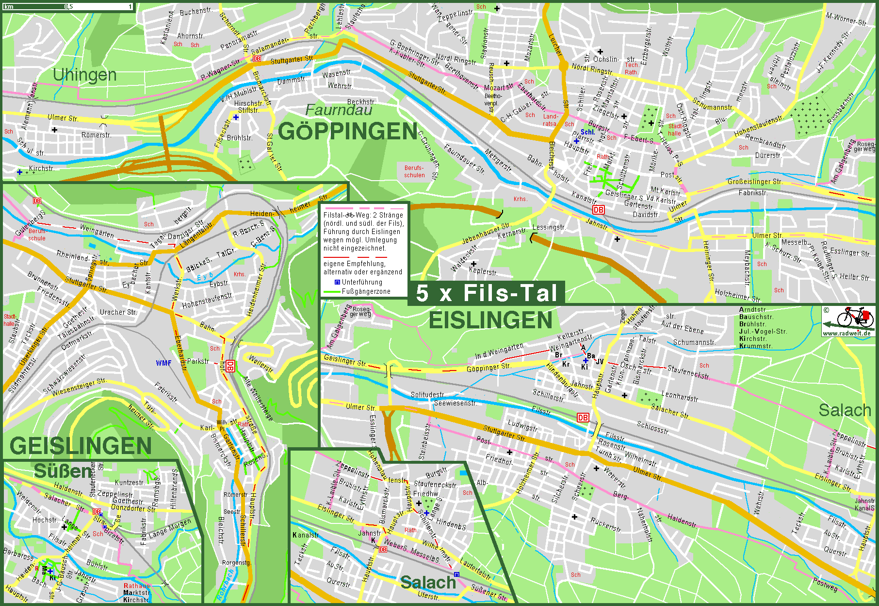 Stadtplan mit Radwanderweg bzw.Fahrradroute 5 mal Filstal auf einen Blick: Geislingen, Süßen, Salach, Eislingen, Göppingen