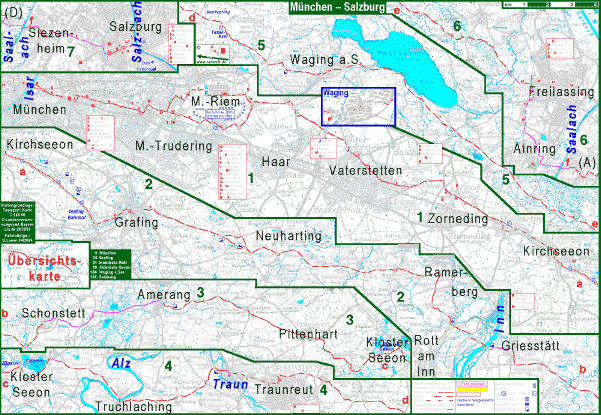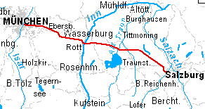 Mit dem Fahrrad direkt von München nach Salzburg: Aus München nach Zorneding, Kirchseeon und Grafing gibt es eine gute Alternative zur B 304: Diiem empfohlene Route führt durch die Hansjacobstr. nach Kirchtrudering, von dort auf verschiedenen Wegen zwischen der Rosenheimer Bahn und der Messe München nach Salmdorf und Ottenbichl. Dann durch den Norden von Vaterstetten und durch Pöring nach Eglharting. Von Eglharting nach Kirchseeon hat di eRoutte zwei Vaaaarianten: entweder ein kurzes Stück Bundesstraße oder weiter sülich über Ilching. Von Kirchseeon nach Grafing kann man entweder auf ruhigen Straßen über Fürmoosen radeln, oder auf dem recht guten Schotterweg neben der Bahn, den man dann aber auch südwärts verlassen muss, da er vor dem Bahnhof Grafing unterbrochen ist. Von Grafing nach Osten auf mittleren bis kleinen landstraßen in Richtung Ramerberg. Von Ramerberg nach Rott-am-Inn-Katzbach zur außerhalb des eigentlichen Marktortes Rott gelegenen Brücke über den Inn. Von Griesstätt am Ostufer des Inn über Amerang zum Kloster Seeon. Trutlaching mit der Brü,cke ü, die Alz gehört mit zur Gemeinde Seeon. Von der Alz an die Traun ist die Straße ruhg aber hügelig. Von Sankt Georgen an der Traun ins eigentliche Traunreut wenige km stark befahrener Straße Von Traunreut nahc Waging am See auf erst mitleer, dann ruhigen Straßen. Von Waging am See auf nicht ganz ruhiger, dafür aber direkter Straße an den Westrand von Freilassing. Von Freilassing nach Salzburg nicht auf der stark belasteten Hauptstraße, sondern am Westrand des Ortes sü,dwärts nach Ainrig.(Wegweisung Salzradweg) Von Ainring gibt es für's Fahrrad einen gut befahrbaren Schleichweg nach Salzburg. |