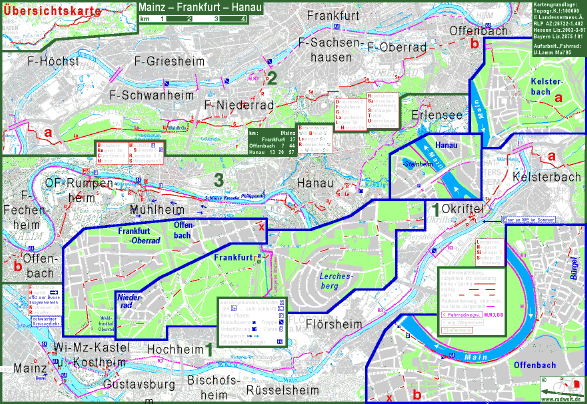 Per Fahrrad direkt von Mainz nach Frankfurt am Main, Offenbach und Hanau: Die Route folgt von Mainz bis Okriftel im wesentlichen dem hessischen Radfernweg R3. Statt über die Theodor-Heuss-Brücke und Wiesbaden-Mainz-Kastel kann man allerdings auch über die Eisenbahnbrücke und (Ginsheim)-Gustavsburg nach Wiesbaden-Mainz-Kostheim radeln. Am Westrand von Flörsheim kann man mit dem Fahrrad nicht am Mainufer fahren, sondern macht einen Umweg um ein Werksgelände.Vor der Altstadt von Flörsheim ist man allerdings wieder am Mainufer und folgt diesem bis hinter Eddersheim. Die Brücke an derStaustufe Eddersheim hat leider Treppen. In Okriftel verlässt der R3 ein Stück weit den Main. Da die Fähre in Okriftel nur sonntags im Sommer fährt, radelt man auf dem kürzesten Weg, der nur mäßig befahrenen L3006 zur Mainbrücke der B40. Diese Brücke hat beiderseits Geh-und-Rad-Wege ausreichender Breite. Da durch den Industriepark von Höchst beide Mainufer flussaufwärts der Brücke nicht mit dem Fahrrad zu befahren sind, fährt man am besten an den alten Ortskern von Kelsterbach und von dort durch die Langschneise um Unterwald nach Frankfurt-Unterrad. Hier gabelt sich die Route: Ins Zentrum von Frankfurt gelangt man einfach auf den Straßen, die die Straßenbahnlinie 12 befährt. Das Museumsufer unterhalb der Straße Schaumainkai ist allerdings nicht selten so voller Spaziergänger, dass man mit dem Fahrrad nicht schnell voran kommt. Der Weg nach Offenbachauf dem Mainufer ist aber leicht zu finden und unterquert alle Brücken. Die andere Route geht am Südrand von Frankfurt entlang nach Offenbach. zur besseren Orientierung wurden hier einige Stadtplanausschnitte in die Karte gebracht. Teilweise ist der Südrand von Frankfurt recht hügelig. Zwischen dem Zentrum von Offenbach und dem Stadtteil Rumpenheim (ein Dorf mit Schloss) kann man iene Mainschleife abkürzen und dabei im Stadtteil Bürgel eine lange gerade Nebenstraße benutzen. In Rumpenheim erspart man sich das Kopfsteinpflaster des Ortkerns, wenn man statt am Mainufer auf der recht kleinen Landstra&szli;e nach Mühlheim fährt. Ortskundige bleiben gern bis zum Ostrand von Dietesheim auf dem "hohen" Mainufer. Zzt. ist aber auch der Asfalt des unteren Uferwegs (Radwanderweg) ohne gröszlig;e Mängel. Hinter der Staustufe Kesselstadt (Brücke dort mit Treppen) ist der Radwanderweg teilweise geschottert. Am Rand von Hanau-Steinheim sind Kompromisse zwischen ruhig, direkt und gut befahrbar zu machen. Um auf die Steinheimer Brücke ins eigentliche Hanau zu kommen, sollte man jedenfalls das Mainufer spätestens am "Nizza" verlassen, durch "Zur Römerbrücke" und andere kleine Straßen zur Bahnhofsunterführung Steinheim fahren, die man auf dem Fahrrad benutzen darf. Jenseits der Brücke geht es nach Norden zum Stadtzentrum. Um weiter nach Erlanbach zu fahren, von dort durchs Kinzig-Tal oder durch Ronneburg nach Büdingen, sollte man nach der Brücke aber nach Osten fahren (Wegweisung Hauptbahnhof). |