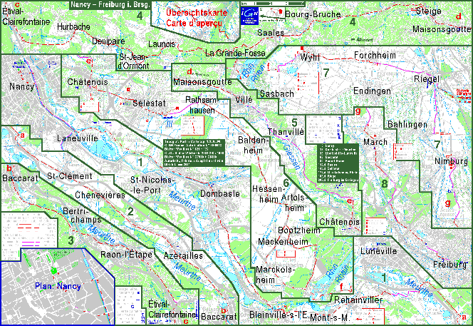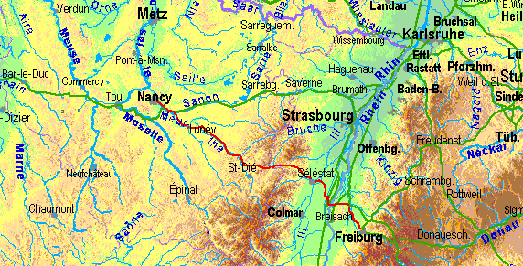 Auf dem Fahrrad direkt von Nancy nach Freiburg im Breisgau: Die Empfehlung gilt natürlich gleichermaßen für Touren von Freiburg nach Nancy. Die Route folgt von Nancy aus der Meurthe aufwärts bis in die Vogesen. Dabei wird Lunéville südlich umfahren, wodurch der Routenverlauf auch nicht ganz so geschlängelt ist wie der Fluss. Anfang 2011 wurde der autobahnartige Ausbau der N59 vollendet. Dadurch steht, sofer es nicht noch kleinere Straßen gibt, die alte Nationalstraße als ruhige bis mäßig befahrene Landstraße zur Verfügung, attraktiv für Reisen mit dem Fahrrad. Nur in relativ kurzen Abschnitten liegen alte und neue Straße so nahe beieinander, dass der Lärm der Schnellstraße die Freude an der beruhigten Landstraße mindert. Kurz hinter Raon-l'Étape verlässt man die Meurthe nach Osten durch das Tal des Baches Hure, an dem das Dorf Hurbache liegt. Die Straße steigt mit sehr moderaten Steigungen durch mehrere Dörfer zum westlichen Vogesenkamm an, der am Col du Las (702 m) überquert wird. Die Vogesenquerung in dieser Richtung hat bei Radreisen den Vorteil, dass der erste Vogesenkamm der höchste ist. Hinter La Grande-Fosse steigt die Straße nochmal etwas an, dann kommt man durch Saales an der oberen Bruche (dt.: Breusch), wo sich mehrere Passstraßen treffen. Blickfang des Hochtales ist der 96t m hohe Climont. Die Nebenstrecke von Saales nach Bourg-Bruche ist von der Ruhe her sehr angenehm mit dem Fahrrad, hat aber verlorene Höhen und in Gegenrichtung einen sehr steilen Anstieg. Der tiefste auf der empfohlenen Route erreichte Punkt in Bourg-Bruche liegt etwa 510 m über dem Meer. Der Anstieg von dort nach Osten ist sehr sanft die Passhöhe des Col de la Salcée liegt nur 588 m über dem Meer. V on da rollt man zwar zuerst das Tal eines Zuflusses der Breusch, aber dessen Abgrenzung zum Tal der Giessen liegt hier kaum über dem Talgrund, so dass man ohne Anstrengung den Col de Steige (537 m) an der Wasserscheide zwischen Breusch und Giessen erreicht. Dem Bach Giessen de Steige und dann der Giessen selber folgt man bis an den östlichen Vogesenrand. Ab Villé ist die Talstraße stark befahren. An den straßenbegleitenden Radweg zwischen Villé und Thanvillé schließt sich ein gut asphaltierter straßenferner Radweg am linken Talrand an, der allerdings an ener Bergnase noch eine verlorene Höhe hat. Am Rand der Oberrheinischen Tiefebene fährt man mit dem Fahrrad sinnvollerweise zuerst südwärts nach Châtenois (Keschtaholz, Kestenholz). Dort an der Maire links erreicht man durch die Rue Clémenceau am Friedhof den alten Weg nach Schlettstadt (Vieux chemin de Séléstat *, Schlettschvej **, Schlettschweg ***). Auf diesem gut asphaltierten Weg darf man mit dem Fahrrad die kreuzende Schnellstraße überqueren, mit dem Auto nicht. Ein geräumiger Wartebereich zwischen den Richtungsfahrbahnen erleichtert die Querung. Von Séléstat an den Rhein gibt es Radwege bzw. Radfahrstreifen an der stark von LKW befahrenen D424. Stattdessen wurde eine etwas längere ruhige Streck getestet: Vom Freizeitgelände und Festplatz Tanzmatt an der Ill in Séléstat gelangt man über die kurze Siedlungsstraße Rue des Écrevisses zu einem noch nicht ausgeschilderten asphaltierten Radweg nach Rathsamhausen, von dort über ruhige Straßen nach Baldenheim, Hessenheim, Artolsheim. Von dort kann man entweder auf relativ lauten Straßen bis zur Staustufe und Brücke Marckolsheim radeln, oder durch Mackenheim über Feld- und Waldwege, wovon etwa 1 km nicht asphaltiert ist, sondern einen zwar allwettertauglichen aber recht groben Schotterbelag hat. Wenn man in Deutschland dann nicht endlos Umwege fahren will, bleibt man noch drei Kilometer auf der von der Brücke kommenden Hauptstraße und biegt dann auf einen asphaltierten Feldweg zum nordöstlich gelegenen Wyhl ab. Dieser Weg ist nur südlich an Straße angebunden, man befährt zwischen Straße und Dorf also in beiden Richtungen dieselbe Überführung. Von Wyhl radelt man auf ruhigen Straßen und asphaltierten Feldwegen nach Riegel am Kaiserstuhl, von dort abseits von Straßen über Nimburg nach Neuershausen, von dort überwiegend auf mäßig befahrenen Straßen nach Freiburg. Fußnoten: * Straßenschild, französisch ** Straßenschild, elsässisch *** französische Landkarte 1 : 25.000 Anschließende Routen: Im Westen nimmt die Route von Laneuveville-devant-Nancy bis Dombasle-sur-Meurthe den gleichen Weg wie die Route Im Osten geht durch Riegel auch die Route Die Route |