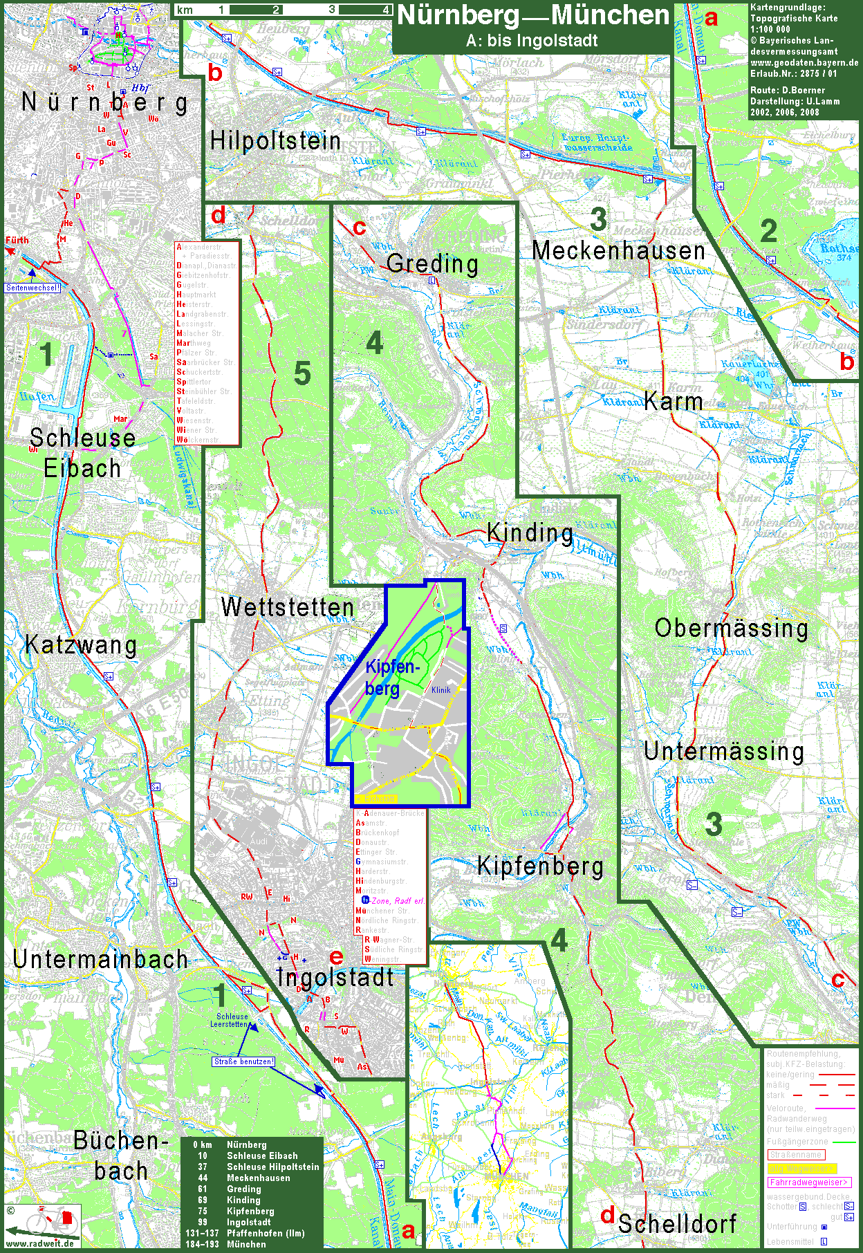 Auf dem Fahrrad von Nürnberg und direkt nach Ingolstadt und München: Am Rhein-Main-Donau-Kanal bis Meckenhausen, an der Schwarzach abwärts von Obermässing durch Greding bis zur Mündung. An der Altmühl flussaufwärts von Kinding bis Kipfenberg. Von dort über die Fränkische Alb nach Ingolstadt. Zwischen Ingolstadt und Paffenhofen und zwischen Ilmünster und München gibt es jeweils mehrere Alternativen. In der Trackdarstellung und der darauf fußenden Vermessung sind Stränge zusammengefasst, die nach gleichen Prinzipien erkundet wurden. Grundsätzlich ist jede Variante nördlich von Pfaffenhofen mit jeder Variante südlich davon kombinierbar. |