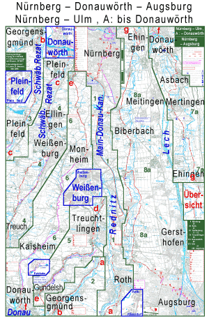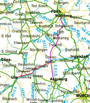 Auf dem Fahrrad Nürnberg nach Donauwörth, Augsburg und Ulm: Die Route überquert zwar zwei Wasserscheiden, aber nur ein Gebirge. Grund sind die günstigenTalverläufe der sich in F¨rth zur Regnitz vereinenden Flüsse. Die am Südrand von Nürnberg fließende Rednitz entsteht in Georgensgmünd aus derfränkischen und der Schwäbischen Rezat. Der flussaufwärts folgend gelangt man durch Pleinfeld, Ellingen und Weißenburg zur kontinentalen Talwasserscheide bei Graben. Hier wurde unter Karl dem Großen der erste Versuch gemacht, einen Main-Donau-Kanal zu bauen, die Fossa Carolina. Von Treuchtlingen aus folgt man dem selben Tal in die Fränkische Alb, wie die Bahnlinie NürnbergAugsburg. Da es von der Alb nach Donauwörth keine geeigneten Nebenstraßen gibt, ist der teilweise mehrere 100 m von der Straße entfernte durchgehend asfaltierte Radweg der B2 sehr hilfreich. In Donauwörth gabelt sich die Route: Der Zweig nach Augsburg wird in zwei Varianten empfohlen: Die Route am Hügelfuß (Biberbach Gablingen) vermeidet Städte, hat aber hier und da eine kleine Steigung. Die Route mehr mitten im Lechtal vermeidet fast jegliche Steigung, füHrt aber durch größere Orte wie Meitingen und die Stadt Gersthofen. Der Radwanderweg "Romantische Straße" ist fast auf ganzer Länge geschottert und daher hur für den Nahbereich von Augsburg zu empfehlen immerwieder durch Baustellen unterbrochen. Der Zweig nach Ulm hat ebenfalls zwei Varianten. Von denen ist allerdings bisher erst die südliche (durch Riedheim) zusammenh”ngend als Karte dargestellt. Die nördliche (Karte siehe auch Regensburg Stuttgart, Blatt B, Felder 8 und 9 und Würzburg Ulm, Blatt B, Felder 11 und 12) ist 1 km k&uul;rzer und schotterfrei, zusammenhängend aber nur als Track verfügbar. Beide folgen auf manchen Abschnitten dem Donau-Radwanderweg. Für einige der Umwege und Schotterstrecken des Radwanderwegs wurden bessere Alternativen gesucht und abgefahren, besonders von Höchstädt nördlich an Dilingen vorbei nach Lauingen. Zum Vergleich wurden schon in der Landkarte als ungünstig erkennbare Abschnitte des Donauradwegs auch ohne Test mit dargestellt. Besonders geeignete sind im Wechsel in den Signaturfarben für Empfehlung und für Wegweisung dargestellt. In Gundelfingen gibt es eine Stadtplantafel für Radfahrer, die zwar die Bundesstraße und den Radwanderweg zeigt, andere zum Radfahren wichtige Straßen aber leugnet. Die Wegweisung in Offingen hat die Qualität von Wegelagerei: Nahe dem rechten Donau-Ufer beginnt der besser zum Vorankommen geeignete Zweig auf dem Uferdamm, der den eigentlichne Ort nicht berührt. Das Wegweiserschild dafür ("Ulm über Günzburg") ist zwar ziemlich groß, befindet sich aber nicht an dem Pfahl mit den anderen Wegweisern, sondern auf einer Stellwand mit mehreren ausführlichen Schautafeln, die nicht liest, wer schnell nach Ulm will. | ||||