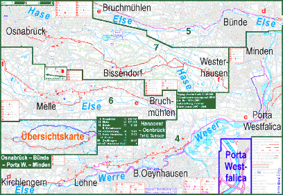 Auf dem Fahrrad von Osnabrück direkt nach Minden und von Hannover direkt nach Osnabrück Von Osnabrück bis knapp westlich von Minden gibt es zwei verschiedene Varianten: Die nördiche ist ländlicher und entspannter zu radeln, trotz 100 Höhenmetern mehr. Die Route überquert nä,mlich alsbald das Wiehengebirge und führt ab Bad Essen durchs norddeutsche Tiefland. Dabei geht es auf dem Rad entspannt und abwechslungsreich über Asphaltwege und kleine Landstraßen, nicht etwa auf dem endlosen Schotter der Kanalufer des Mittellandkanals. Auf dem letzten Stück vor Minden ist eine Route des Radverkehrsnetzes NRW durch die kleinen Dörfer ausgeschildert. Die südliche Route folgt überwiegend der Niederung von Hase und Werre. Dabei wurden verglichen mit der ausgeschilderten Route einige autobahnnahe Abschnitte vermieden. Zwischen Bissendorf und Melle gibt es im Tal der Hase an einer Stelle nur Hauptstraße und einen unbefestigten Weg. Darum verlässt, die Route hier das Tal und führt südlich eines Hügels über einen niedrigen Sattel. Östlich von Melle gibt es eine nette kleine Straße durch die Wiesen. Sie zu nutzen verursacht aber einen Umweg durch das Zentrum von Melle. Durch Bünde kommt man per Rad gut auf dem Radwanderweg am Ufer der Else. Ab Kirchlengern, also im Stadtgebiet von Löhne und in den nördlichen Vororten von Bad Oeynhausen ermöglcht eine teilweise als Teil des Radverkehrsnetzes NRW ausgeschilderte Routenwahl, sich außerhalb der Lärm-Abgaszone der E30 (A30, B61) zu bewegen, in der der Sielpark an der Werre liegt. An der Weserbrücke in der Porta Westfalica sollte man sich entscheiden, ob man links der Weser ins Zentrum von Minden radelt, oder rechts des Flusses an Minden vorbei nach Stadthagen und Hannover. |