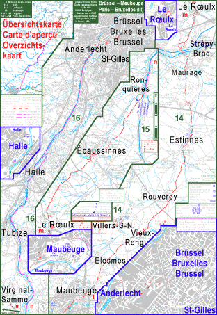 Auf diesem Weg gelangt man mit dem Fahrrad bequem und schnell bis zu den Hafenbecken im Br&üsseler Vorort Anderlecht. Hier wechselt der Radwanderweg auf das westliche Kanalufer, aber leichter ins eigentliche Brüssel gelangt man mit der mäßig befahrenen Straße auf dem Ostufer. An der Grenze zwischen Anderlecht und Brüssel stellen große verkehrsreiche Plätze ein gewisses Hindernis dar. In der Altstadt von Brüssel sind die meisten Einbahnstraßen und wichtige Telie der Fußgängerzonen zum Radfahren freigegeben. An touristisch besonders interessanten Stellen können aber Menschentrauben der Durchfahrt im Wege stehen. Die bekannte Grand-Place (Grote Markt) liegt kaum über dem Niveau des Kanals. östlich davon steigen die Straßen aber recht steil an.