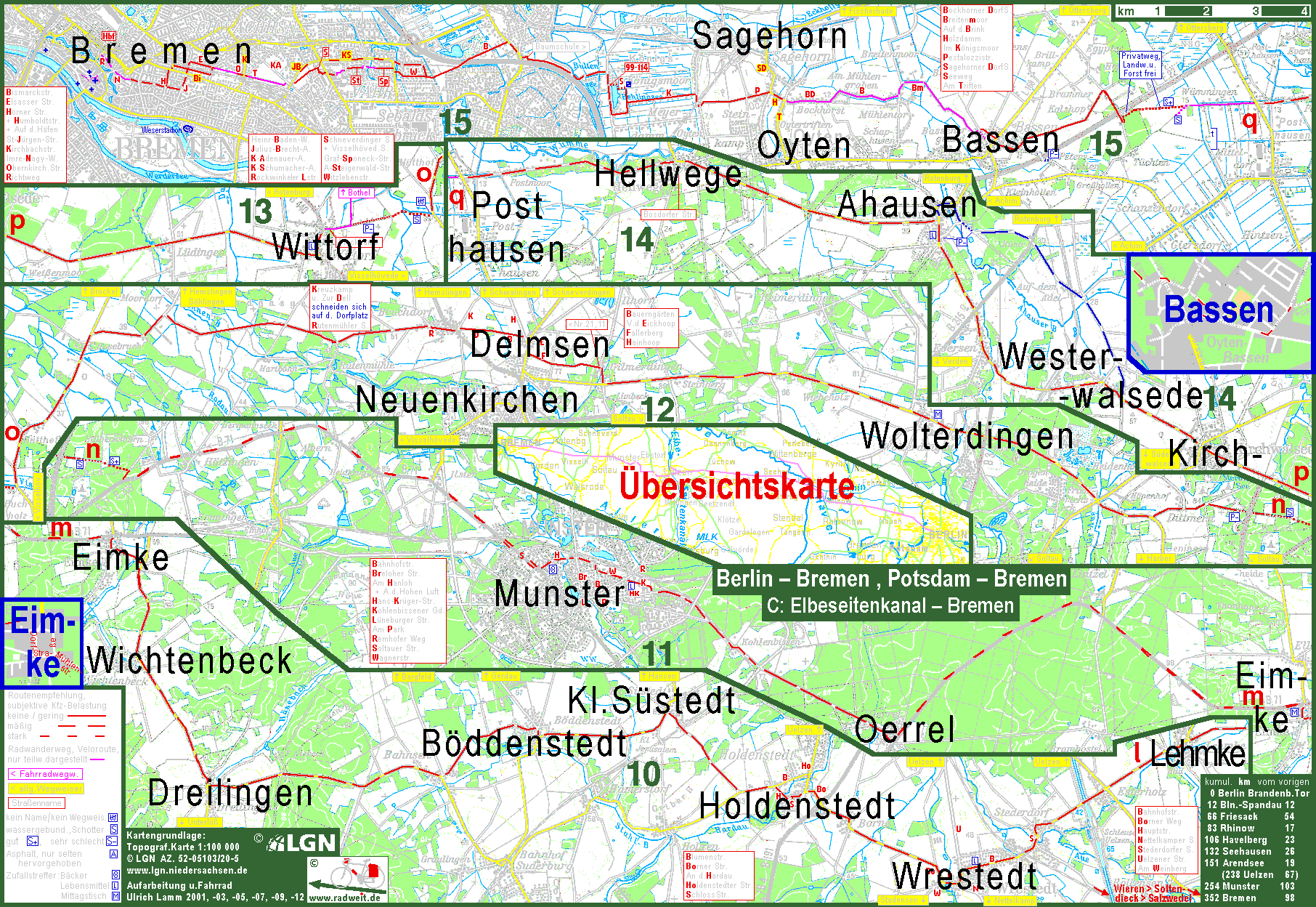 Mit dem Fahrrad direkt von Potsdam nach Bremen: Vom Rand des Schlossparks Sanssouci radelt man in einer S-Kurve weitgehend abseits der B273 nach Nordwesten. Von Uetz-Paaren durch Ketzin fährt man auf der Landstraße nördlich der Havelseen, dann von Roskow auf einer als Radweg asphaltierten Bahntrasse ü ber den Beetzsee. Durch Wälder und Felder im Zentrum des Havellandes führen gering bis mäßig befahrene Straß en nach Rathenow. Die Straße von Rathenow-West durch das Land Schollene ist nicht stark befahren und nicht so umwegig wie die ausgeschilderten Radwanderwege. Die Elbe wird mit der Fähre bei Sandau überquert. Weiter geht die Tour durch Osterburg und den Norden der Altmark nach Salzwedel Durch den Drawehn geht die Route südlich an Uelzen vorbei nach Munster. Vor und nach Munster in der Lüneburger Heide muss man leider recht große Straßen fahren, wenn man nicht im Sand Stecken bleiben will. Der Eingang des Heideparks wird passiert. Nördlich an Visselhövede vorbei geht es durch Kirchwalsede, Hellwege, Oyten-Bassen nach Bremen; Wümmeniederung, zwischendurch auch Verdener Heide. |