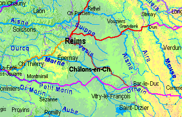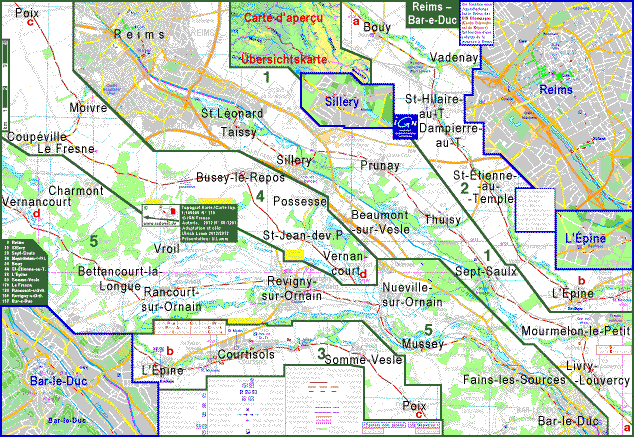 Mit dem Fahrrad von Paris direkt nach Reims: Unabhängig von ihrer Betitelung ist diese Route in beiden Richtungen gleichermaßen gut zu radeln. Von der Kreuzung knapp 100 m vor der Kathedrale von Reims fährt man sinnvollerweise durch die Stadt zur Basilique St. Remi (ebenfalls auch von innen sehenswert). Von dort nach rechts kommt man an den Canal de Reims (Man kann ihm schon ab dem Stadtzentrum folgen, aber dort ist er von der Autobahn verlärmt.). Wo die Ausbaustrecke des Kanalufers endet, wechselt man auf ruhige bis mittlere Landstraßen. Hinter Sillery wird die Gegend ehrlich gesagt etwas langweilig, weil das Gel”ände beiderseits der Vesle hier kaum ansteigt. Die Basilika von L'éspine ist so etwas wie die kleine Schwester der hundert Jahre älteren Kathedrale von Reims, hat aber spitze Türme. Anschließend fährt man durch das Dorf Courtisols, das sich zu beiden Seiten der Vesle dahinzieht. Es hat drei aus der romanischen Stilepoche stammende Dorfkirchen. Hinter Somme-Vesle, wie der Name andeutet nahe der Quelle der Vesle gelegen, kommt man durch eine sehr dünn besiedelte Gegend mit 10 Einwohnern pro km2 und darunter. Schließlich erreicht man bei Bettancourt-la-Longue das Tal des Ornain, dem man bis Bar-le-Duc folgt. Westlich der Stadt ist der Kanaluferweg noch nicht als Radweg ausgebaut, was aber kein Mangel ist. In Bar-le-Duc selber samt Vororten radelt man besser fernab des Durchgansgverkehrs auf Stadtstraßen als auf dem ausgebauten Radweg neben der Schnellstraße. Die Altstadt von Bar-le-Duc besteht aus der bequem erreichbareren Unterstadt und der von den Gebäuden her interessanteren Oberstadt. Als einstige Hauptstadt eines auf der Grenze des Königreichs Frankreich und des Heiligen Römischne Reiches gelegenen Herzogtums weis es einige Renaissancebauten auf. Anschließende Routen: In Rancourt-sur-Ornain trifft man auf die Route Paris Strasbourg/ Pforzheim Weil der Stadt: Teil II) Champagne Bar-le-Duc Toul, Teil III) Toul Saverne Brumath (und Strasbourg), Teil IV) Brumath RA-Wintersdorf Ettlingen Weil der Stadt. In Laneuveville-devant Nancy bzw. Dombasle-sur-Meurthe schließt an Teil III die Route Nancy Freiburg i.Brsg. an. Und von der Rheinbrücke Wintersdorf (Teil IV) gelangt man auf der Route Karlsruhe Strasbourg (Karlsruhe Basel, Teil A) nach Karlsruhe |