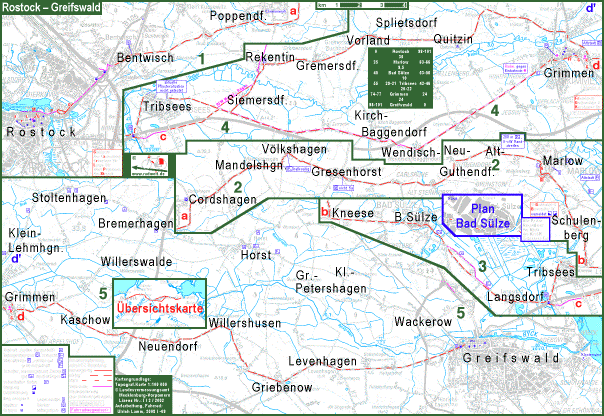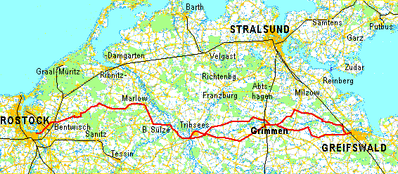 Auf dem Fahrrad direkt von Rostock nach Greifswald: Im ersten Abschnitt stimmt das direkt nicht ganz, da die von Bentwisch bis Kneese ruhige Strecke über Marlow nach Bad Sülze 8km länger ist als die über Sanitz und Kneese. Hinter Bad Sülze kann man mit dem Fahrrad auf einer ruhigen aber etwas schadhafte Ortsstraße parallel zur stärker belasteten L19 fahren. Hinter Langsdorf wurde die A20 sehr nahe an die Landstraße gebaut. Ab kurz vor Tribsees stehen mehrere Rouuten zur Wahl: Zunächst kann man wahlweise durch Tribsees radeln (Die Befahrung dieses Zweiges durch den Autor liegt leider schon etliche Jahre zurück), oder kurz vor der Autobahnauffahrt auf einem nicht ausgeschilderten Weg die Autobahn unterqueren und dann auf einem ebenfalls asphaltierten Radweg südlich ds Knotens ostwärts fahren In Gegenrichtung ist der Radweg nicht zu verpassen. Wo die von Tribsees kommende und di eneben der Autobahn verlauifende Straße wieder zusammentreffen kann man wahlweise auf einem asphaltierten Teilst¨ck des Radwanderwegs M ü r i t z R ü g e n (ehemalige Bahntrasse) oder auf einer ruhigen Straße nordwärtsnach Rekentin gelangen. Die ruhige Straße nördlich der Trebel nach Grimmen ist kaum weiter als die südliche über Kirch Baggendorf. Die südliche (L19) hat allerdings seit der Fertigstellung der Autobahn in diesem Abschnitt kaum noch Fernverkehr. Durch Grimmen kommt man auf ihr angenehmer, denn die nördliche Route stellt Reisende auf dem Fahrrad hier vor die Wahl, sich entweder über das Kopfsteinpflaster der Altstadt zu quälen, oder die Umgehungsstraße (B194) zu benutzen. Von Grimmen nach Greifswald steht auf mehr als der Hälfte der Distanz eine angenehm ruhige Straß zu Verfügung In Griebenow landet man dann aber auf der unlängst zur B109 erhobenen L26, eine der Haupt-Autozufahrten nach Greifswald Die nicht mit dieser Lärmstrecke belastete nördliche Alternative über Stoltenhagen, Bremerhagen, Horst und Wackerow ist leider nicht zu empfehlen, solange die Straße durch Gerdeswalde, den östlichen Teil des Dorfes Horst, aus übelstem Kopfsteinpflaster besteht. In Greifswald selber gibt es einen Trost für die B109: Der Bahnübergang Grimmer Str., vorher Haupt-KFZ-Strecke, wurde durch eine Fuß-und-Fahrrad-Unterführung ersetzt. |