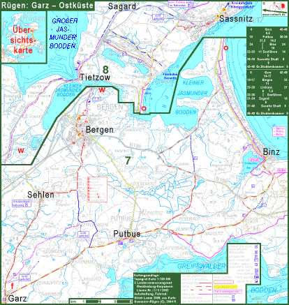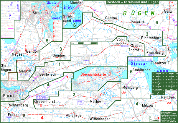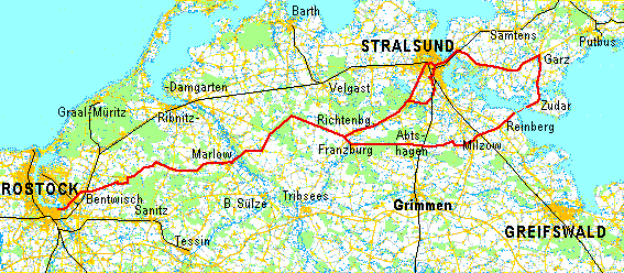 Auf dem Fahrrad direkt von Rostock nach Stralsund und nach Rügen: Wer dem Ostseeküstenradweg folgt, um von der Rostocker Innenstadt nach Stralsund zu radeln, macht einen ziemlichen Umweg nach Norden. Vom Rostocker Nachbarort Bentwisch führt eine ruhige Straße nach Marlow, also sowohl in Richtung Stralsund als auch in Richtung Stahlbrode. Hinter Semlow gibt es gerade Straßen, die aber bezogen auf die Routenziele immer einen Umweg machen. Kurz vor Richtenberg und Franzburg gabelt sich die Route in zwei Alternativen nach Rügen. Die auf dem Fahrrad zurückzulegende Strecke beider Routen ist etwa fast gleich lang. Nördliche Route: durch Stralsund nach Rügen: Über Richtenberg gelangt man auf dem nördlichen Teil des Radfernweges Müritz-Rügen nach Stralsund, dem Ausgangspunkt des Rügendammes. Kurz hinter Negast wird der Radwanderweg an die Hauptstraße heran und dann direkt neben iihr geführt wird. Vor allem wer gleich zum Rügendamm radeln will, hat in Negast die Wahl, ob er oder sie statt auf dem radwanderweg auf ruhigerer Strecke weiter östlich nach Stralsund radeln will. Diese Alternative ist in Richtung Stralsunder Innenstadt etwas weiter als die an der Hauptstraße, in Richtung Rügendamm aber gleich weit wie die Anfahrt durchs Stadtzentrum. Südlichen Route: nach Rügen mit der Fähre: Über Franzburg, Abtshagen, Miltzow und Reinberg gelangt man nach Stahlbrode zur Rügenfähre. Auf Rügen ist die Straße von der Fähre nach Garz deutlich ruhiger als die vom Rügendamm her. Das Warten auf die Fähre (bis zu 20 Min. (früh und spät bis zu 30 Min.) und die knapp 15 minütige. Überfahrt lassen sich gut für ein Picknick nutzen. Der Proviant dafür muss allerdings mitgebracht werden. Das nächste Lebensmittelgeschäft auf Rügen befindet sich in Garz. Das nächste Lebensmittelgeschäft auf dem Festland liegt noch weiter entfernt in Richtenberg. Auf Rügen. Von Garz nach Sassnitz (Seefähren wie Stadt), ist die Route über Bergen wohl die lauteste, aber auch die Routen über Pustbus und Binz sind nicht nur ruhig in Bezug auf Autoverkehr. Von der Landschaft her ist Rügen zwar die schönste deutsche Insel, aber die Insel hat zumindest in der Sommersaison zu viel Autoverkehr, um eine angenehme Urlaubsregion zu sein. Straßenferne Radwege werden zwar beworben, sind aber überwiegend sehr umwegig und von schlechter Oberfläche Eine rühmliche Ausnahme ist der Weg von Binz norwärts in Richtung Sassnitz. |