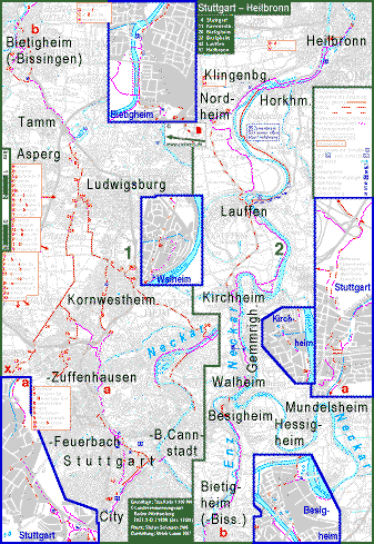 Zwischen Ludwigsburg-Neckarweihingen und Besigheim ist das Tal des Neckar besonders verschlungen und auch nicht durchgä,ngig zu befahren. Da kann man mit dem Fahrrad gut über das Lange Feld abkürzen. Vom Stuttgarter Stadtzentrum her fährt man zweckmäßerweise zunächst zum Pragsattel hinauf. Die Nordbahnhofstr. hat im mittleren Abschnitt wenig Autoverkehr. Und die Steigung verteilt sich gleichmäßer als bei der Fahrt durch den Rosensteinpark. Dieser Park ist zwar recht schön, aber nicht selten voller Spaziergänger. Auch ist das Wegenetz etwas unübersichtlich. Die Route führt vom Pragsattel durch cdne unteren Teil von Stuttgart-Feuerbach und durch Stuttgart-Zuffenhausen, dann durch Kornwestehim und westliche Vororte von Ludwigsburg. In Bietigheim gelangt man ins Enztal. Das rechte Ufer der Enz lässt sich hier ohne Autoverkehr und große Steigungen befahren. Zwischen Walheim und Kirchheim führt der Radwanderweg durch eine sehr enge Unterführung mit Schiebegebot. Zwischen Kirchheim und Lauffen hat man die Wahl zwischen dem etwas l&aum;ngeren, dafür ruhigen und weitgehend ebenen Radanderweg und der kürzeren aber lauteren und mit einigen Höhenmetern verbundenen B 27. In Lauffen kann man fast immer durch das Werksgelä,nde des Zementwerks radeln. Der anschließende Weg auf dem rechten Neckarufer ist aber teilweise geschottert. Die Verbindungen links des Neckars haben dafür einige Höhenmeter, der Radwanderweg ebenso viele wie die kürzere Landstraße. Nach Heilbronn hinein kann man beiderseits dese Neckars mit dem Fahrrad auf autofreien Wegen gelangen.