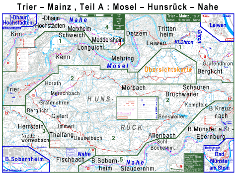 Per Farrrad von Trier direkt nach Bad Kreuznach, Bingen und Mainz: Die Route führt bis Detzem durchs Moseltal, überwiegend auf dem Moselradweg. Von dort geht es in sanftem Anstieg durch den oberen Rand von Leiwen ins Dhron-Tal. Kurz vor dem Übergang wunderschöner Blich über die Trittenheimer Moselschleife. Ab Papiermü,hle im Dhrontal gibt eszwei Varianten der Hunsrückü,berquerung. Die nö,rdliche kreuzt das Dhrontal zwar kurz vor Morbach ein zweites mal, hat aber trotzdem weniger Hömeter Steigung als die 5 km längere südliche Variante über Deuselbach (nahe dem Erbeskopf) nach Allenbach. In Bruchwelier treffen beide Varianten wieder zusammen. Von Schauren geht es durchs Asbach-Tal (Herrstein) nach Fischbach an der Nahe. Im Herbst 2003 gibt es dort nur die Hauptstraßenbrücke über die Nahe. Die Ortsstraßenbrücke fehlt wegen Totalersatz. Von Fischabch durch Kirn Hochstädten (.Dhaun) und Bad Sobenheim nach Bad Münster am Stein folgt die Empfehlung weitestgehend dem Nahe-Radweg. Allerdings vermeidet man in Hochstädten unnötge Wartezeit an einerAmpel, wenn man vorher rechtzeitig vom Radweg auf die Fahrbahn wechselt. In Bad Münster am Stein fä,hrt man besser mehrdurch die Berliner Str. als die Fahrradwegweisung vorsieht. Von Bad Münster am Stein nach Bad Kreuznach gibt es durch den Uferpark mit den Gradierwerken einen speziellen Radweg neben den Fußwegen. Am Anfang von Bad Keuznach sollte man nicht dem Nahe-Radwanderweg in den dortigen Kurpark folgen, wo man zahlreichen Spaziergängern ins Gehege kommt und schließlich über eine Nahebrücke schieben muss. Besser gelangt man nach wenigen hundert Metern Bundesstr. durch eine Bahnunterführung auf die "Ringstr.", beileibe keine Umgehungsstr., sondern teilweise sogar verkehrsberuhigt, die angenehm am Stadtzentrum vorbei leitet. Von Bad Kreuznach nach Mainz empfehlen sich mehrere Varianten: Ab Gensingen wieder dem Nahe-Radweg folgend nach Bingen und von dort, bis Budenheim dem Rhein-Radwanderweg folgend nach Mainz. Von Bingen-Dietersheim nach Bingen-Kempten östlich um den Binger Hügel. Von Bad Kreuznach nach Osten durch Sprendlingen und über die Hügel Rheinhessens (10 km kürzer al süber Bingen). | ||||