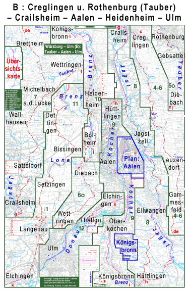 Auf dem Fahrrad direkt von Würzburg nach Ulm: Zwei Talwasserscheiden erleichtern diese Tour durch die Täler von sieben Flüssen. Auch die übrigen Wasserscheiden sind keine hohen Berge. Anderseits führt die Route durch recht viele Städte. Besonders in Aalen ind in Heidenheim (Brenz) erlebt man mehrere km Stadtverkehr. Auf dem Radwanderweg am Ostufer des Würzburger Maintales von Würzburg nach Ochsenfurt an der Mainspitze. Dieser Radwanderweg ist zwar technisch stetig verbessert worden, aber das Umfeld war vor Jahren schöner. Durch die Ausstattung der Maindörfer mit Umgehungsstraßen ist die Bundesstraße immer näher an den Radwanderweg gerückt. und die Verbreiterung des Mains als Wasserstraße hat die meisten Ufergehölze zerstört. Von Ochsenfurt nach Creglingen an der Tauber gibt es zum einen den in ganzer Länge geschotterten Gaubahnradweg. Kürzer per Fahrrad von der Mainspetze an die Tauber kommt man; wenn man in Ochsenfurt durch Die "Klinge" auf die Hochfläche radelt, dann auf Landstraßen zu dem hübschen Städtchen Aub, und nur von Aub nach Bieberehren den Gaubahnradweg nimmt. In Creglingen gabelt sich die Route: Das einfachste Höhenprofil bietet die östliche Variante, die (mit Rothenburg) der Tauber aufwärts bis zur Michelbacher Lücke folgt. Diese Talwasserscheide zwischen Tauber und Jagt wird vom motorisierten Verkehr wenig genutz, ist per Fahrrad um so schöner. Die westliche Variante, von Creglingen geradewegs nach Süden nach Michelbach, ist 12 km kürzer, aber die Hohenloher Hochfläche hat doch einige Hügel. Von Michelbach an der Lücke gelangt man nach Crailsheim an der Jagst und folgt dieser dann bis hinter Ellwangen oder weiter bis zum Rainauer Stausee. Die Wasserscheide zwiischen Jagst und Kocher lässt sich wahlweise ruhiger oder flacher Überqueren. Von Hüttingen geht es an der Kocher aufwärts durch Aalen (leider an ziemlich autoreiche Straßen) nach Oberkochen. Südlich von Oberkochen liegen im selben Tal nur 4 km auseinander die Quellen von Kocher und Brenz. Im Talabschnitt dazwischen gibt es einen Bach, der aber versickert. Im wasserlöslichen Kalkgestein der Alb suxht sich das Wasser leicht unterirdische Wege, um dann irgendwo in sehr großen Quellen, den sogenannten Töpfen zutage zu treten. Nur ein geringer Teil des Wassers der Lone erreicht oberirdisch die Brenz, je nach Wasserführung zeitweise auch gar keines. Eingestreut in den Kalk gibt es aber Nester von Vulkanschutt. Hier haben sich natürliche Wasserreservoirs gebildet, die sogenannten Hülben. Der Brenz folgt man abwärts durch Heidenheim bis zu ihrem Knie hinter Bolheim. Um von hier auf die niedrigen Ausläufer der Aub zu gelangen, das Albuch, gibt es die Landstraße mit einigem Autoverkehr oder eine schöne ruhige Strecke, die mit 18% auf einem beladenen Fahrrad aber schwer zu bewältigen ist. Oben landet man aber auf der selben Ruhigen Route nach Langenau, die zwischendurch 3 km durch das hier autofreie Lonetal geht. Langenau befindet sich schon in der Donauniederung. Die Route von hier nach Ulm führt durch die Siedlungen am Fuß des südlichen Rand der Alb. (Der eigentlich e Rand der schwäbischen Alb ist ja sowieso der nordwestliche) Die letzten Kilometer bis Ulm fährt man erst unausweichlich an einer stark KFZ-belasteten Straße, dann vorzugsweise durch einen Park. Zum Schluss etwas Geschichte: Was hat Ulm mit Görlitz, Frankfurt (Oder) und Laufen am Inn gemeinsam? Es ist eine geteilte Stadt! Anfang des 19. Jahrhunderts wurde mit dem Ende des "Heiligen Römischen Reiches" nicht nur das Territorium der freien Reichsstadt Ulm zwischen Bayern und Württemberg aufgeteilt, sondern auch das eigentliche Stadtgebiet. Die Altstadt nördlich der Donau behielt den namen Ulm, die Neustadt südlich der Donau wurde zu Neu-Ulm, das obwohl oberhalb beide Donauufer württembergisch sind, unterhalb beide Ufer zu Bayern gehören. |